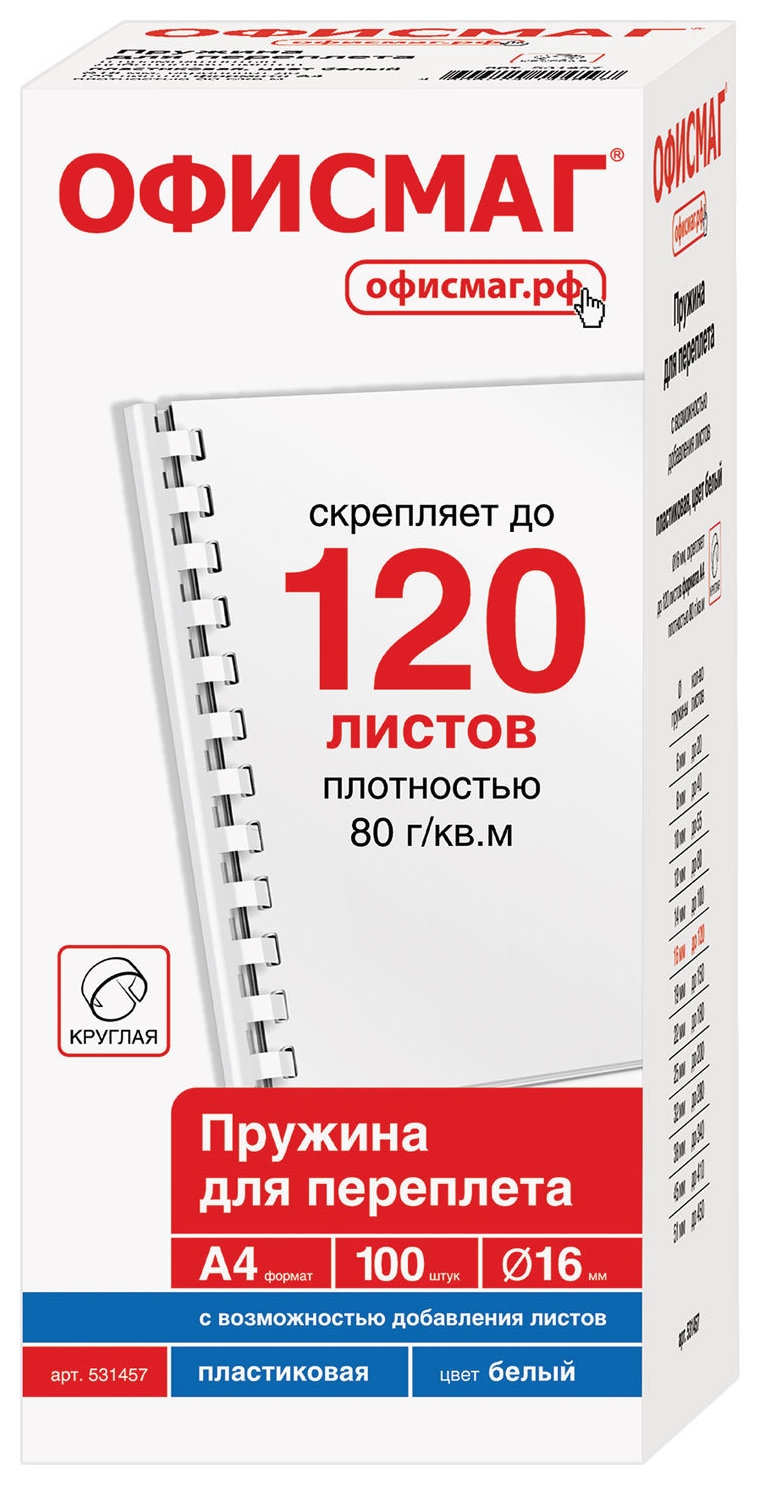 Пружины пластиковые для переплета, комплект 100 шт., 16 мм (для сшивания 101-120 листов), белые, Офисмаг
