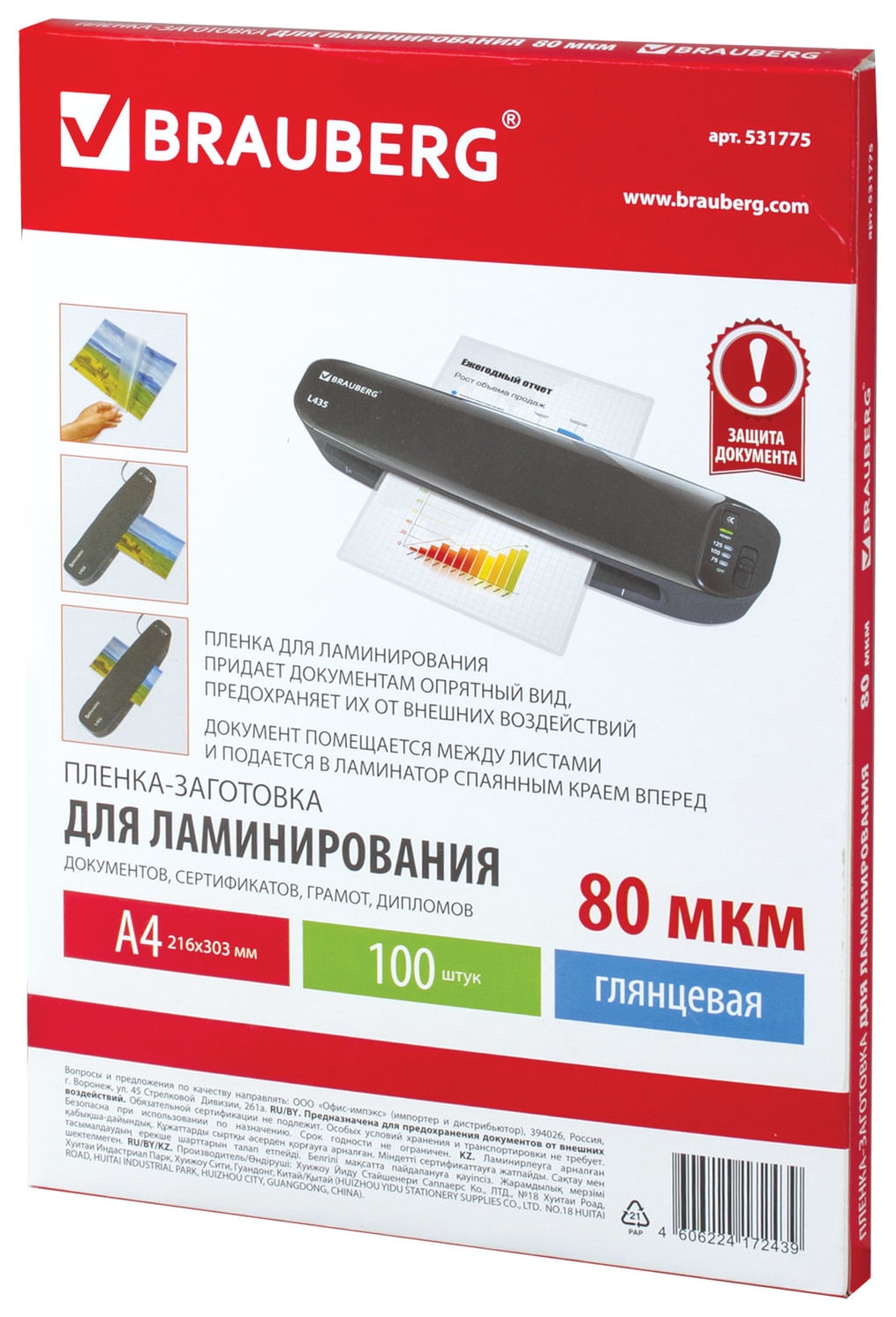 Пленки-заготовки для ламинирования, А4, комплект 100 шт., 80 мкм, BRAUBERG