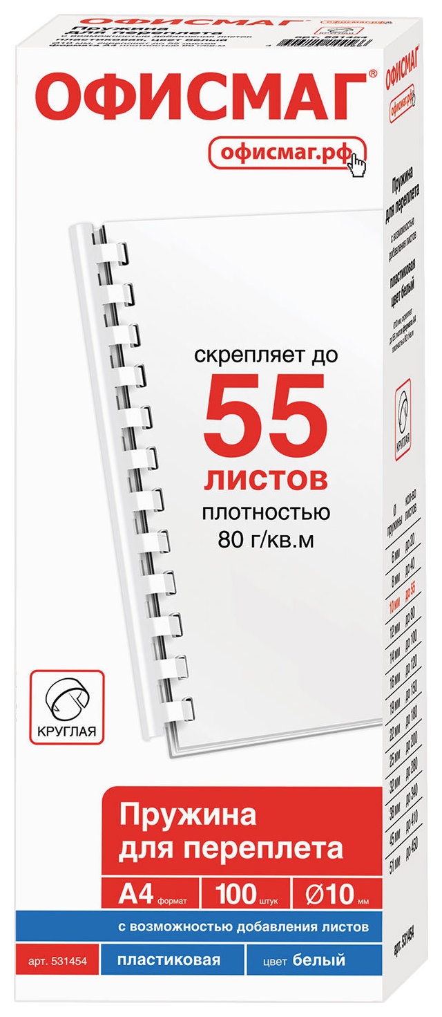 Пружины пластиковые для переплета, комплект 100 штук, 10 мм (для сшивания 41-55 листов), белые, Офисмаг