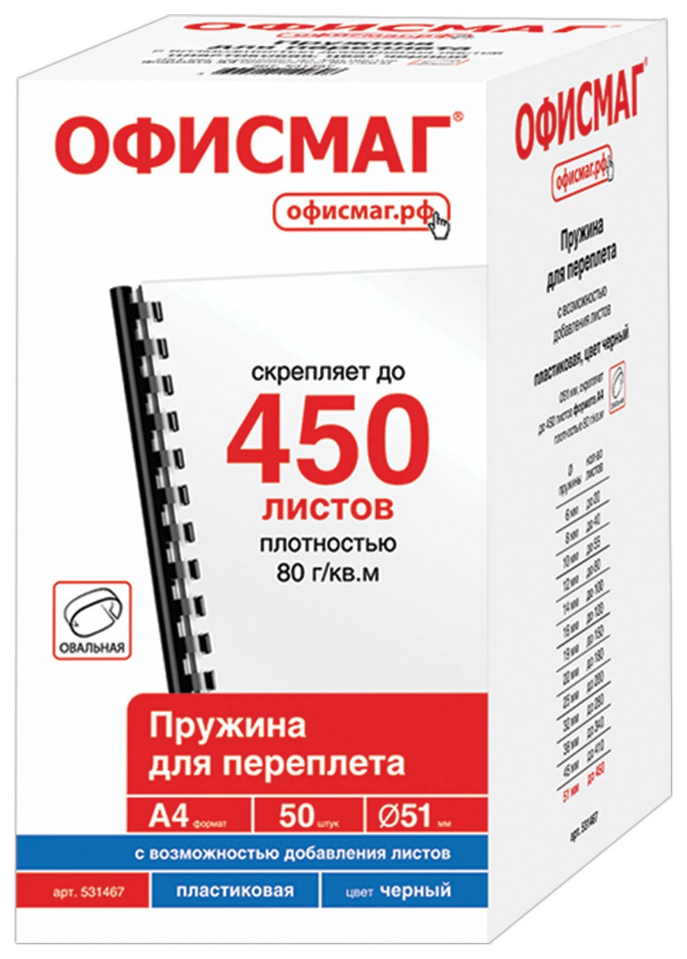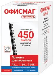 Пружины пластиковые для переплета, комплект 50 штук, 51 мм (для сшивания 411-450 листов), черные, Офисмаг