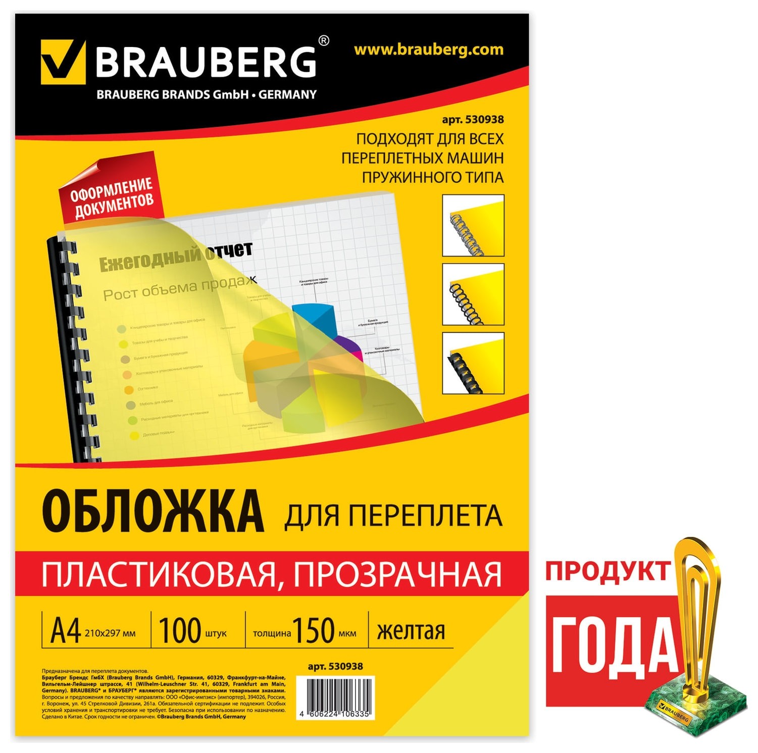 Обложки пластиковые для переплета, А4, комплект 100 шт., 150 мкм, прозрачно-желтые, Brauberg