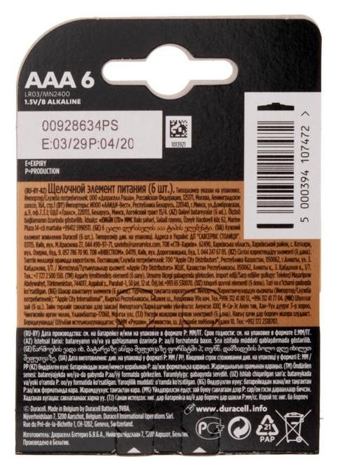 Батарейка алкалиновая Duracell Basic, Aaa, Lr03-6bl, 1.5в, блистер, 6 шт.