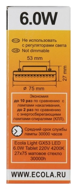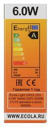 Лампа светодиодная Ecola Light, 6 Вт, Gx53, 4200 K, 27x75, матовое стекло