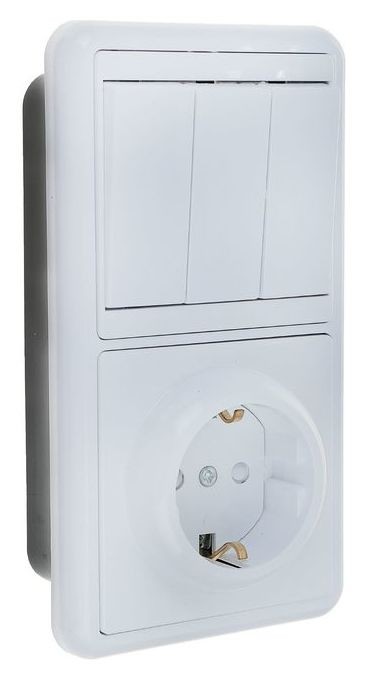 Розетка служит для подключения к сети электроприборов, а трёхклавишный выключатель предназначен для управления освещением в помещении.