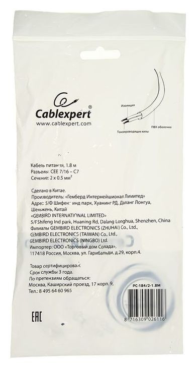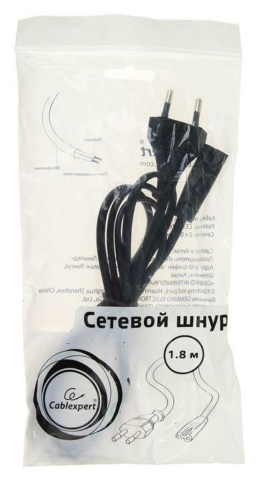 Кабель питания Cablexpert Pc-184/2-1.8m, CEE 7/16 - C7, 2-pin, 2.5 А, 1.8 м, черный