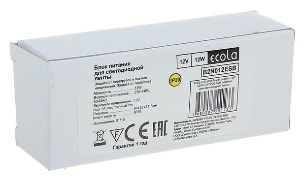Блок питания Ecola, для светодиодной ленты, 12 Вт, 220-12 В, Ip20
