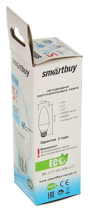 Лампа Cветодиодная Smartbuy, C37, E27, 5 Вт, 4000 К, холодный белый свет