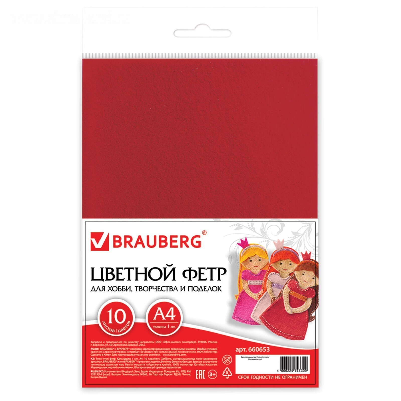 Фетр А4, 10 листов, 10 цветов, BRAUBERG "Солнечный"