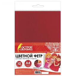 Цветной фетр ОСТРОВ СОКРОВИЩ предназначен для создания ярких творческих поделок дома, в школе и в детском саду. Используется для создания аппликаций и вышивания, легко режется и приклеивается на ровную поверхность. Плотность - 160 г/м2 и толщина в 1 мм гарантируют поделкам отличное качество и долгий срок службы. Цветной фетр формата А4 поставляется в упаковке по 10 листов, в 10 различных оттенках красного цвета. Такое разнообразие придется по вкусу любому покупателю. Фетр Остров Сокровищ обладает приятной нежной фактурой, прост и удобен в использовании. Края не осыпаются при разрезании, благодаря чему не нуждаются в дополнительной обработке.Данный товар относится к среднему ценовому сегменту.