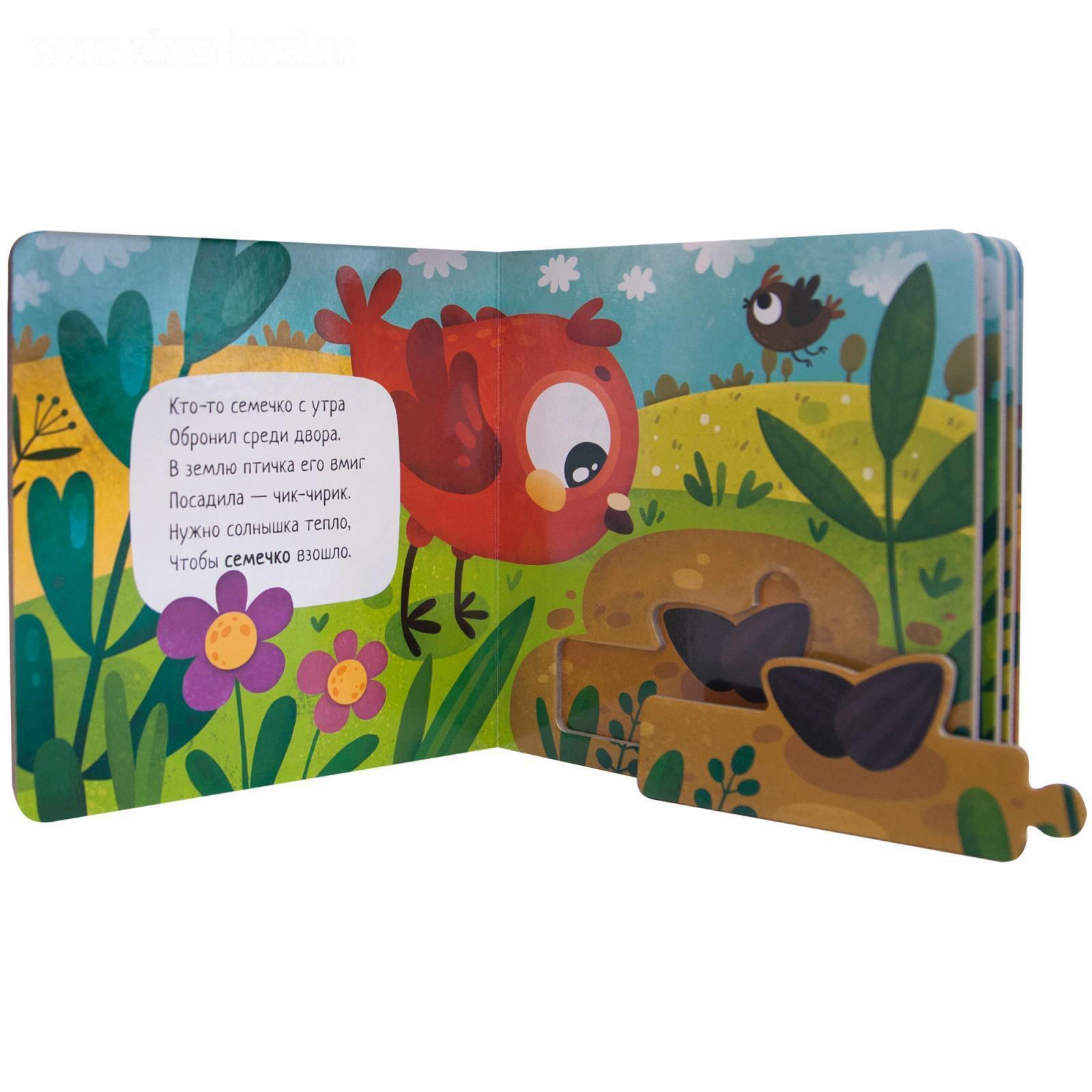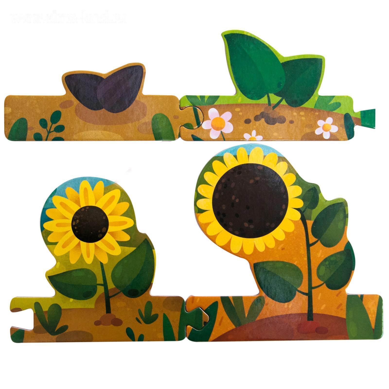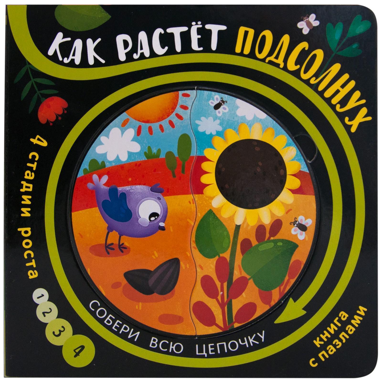 Книга с пазлами «Как растет подсолнух» из серии «Собери цепочку» познакомит ребенка со стадиями роста подсолнуха.