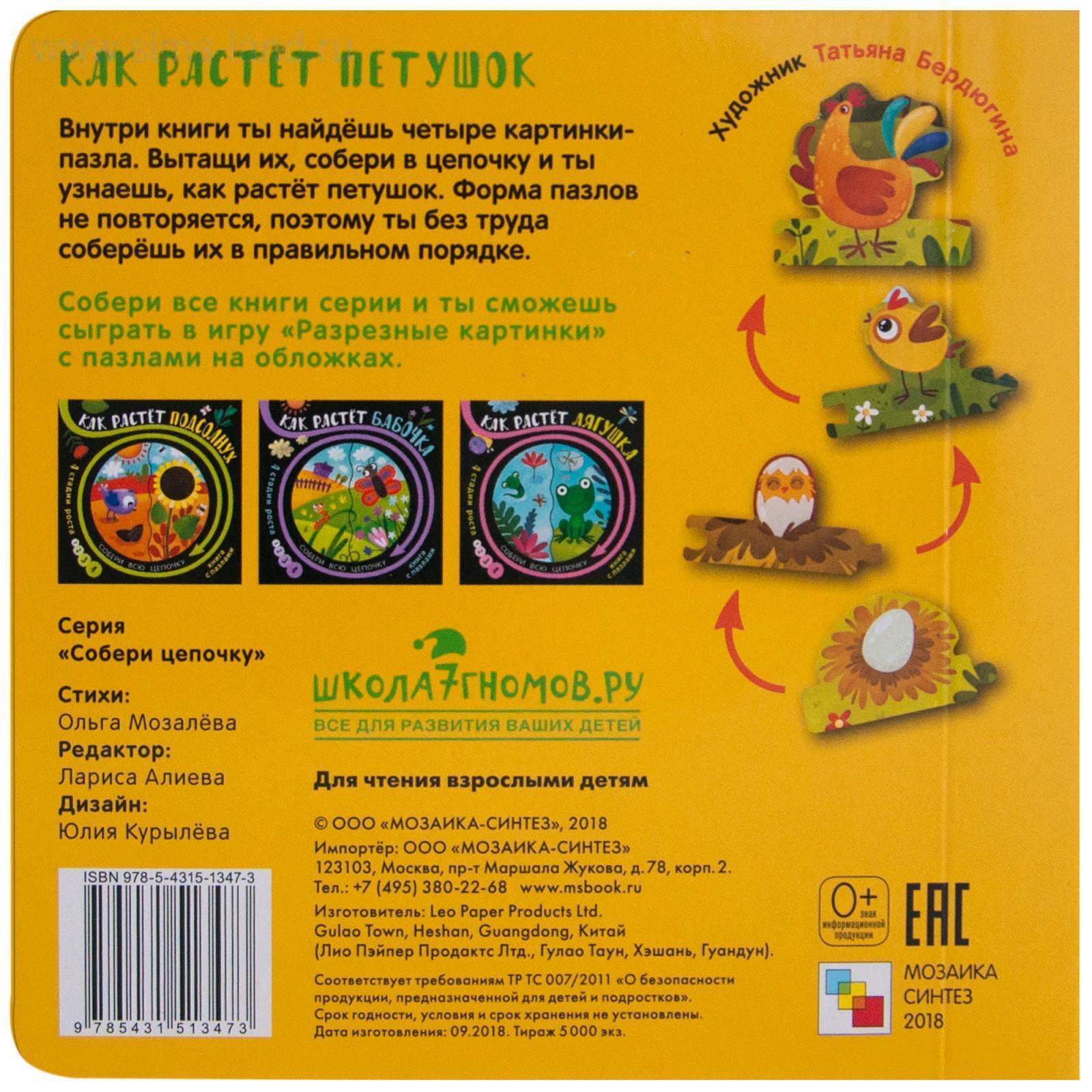 О том, как растут петушок, бабочка и лягушка расскажут другие книги серии «Собери цепочку». Соберите всю коллекцию и Вы сможете сыграть в игру «Разрезные картинки» с пазлами на обложках.