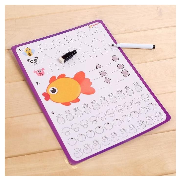 Весь игровой процесс будет проходить на двустороннем планшете. На обратной стороне представлены разные задачки на развитие логики и смекалки. В комплекте идёт маркер. Он легко стирается с планшета и кожи.