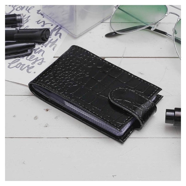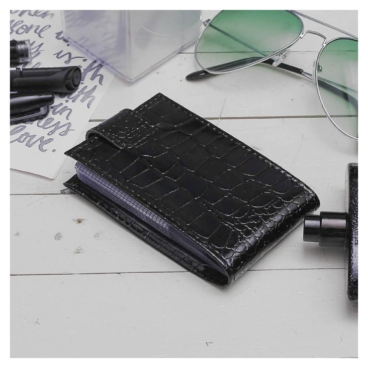 Визитница горизонтальная, 1 ряд, 18 листов, с хлястиком, крокодил, цвет чёрный