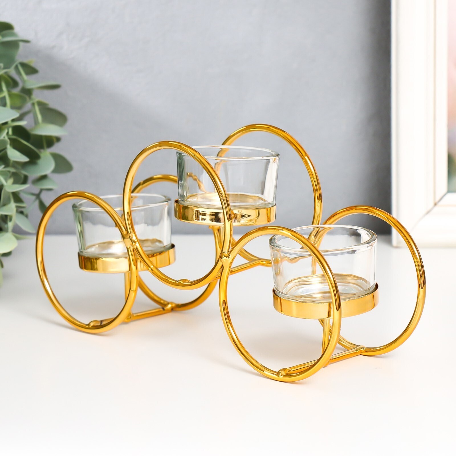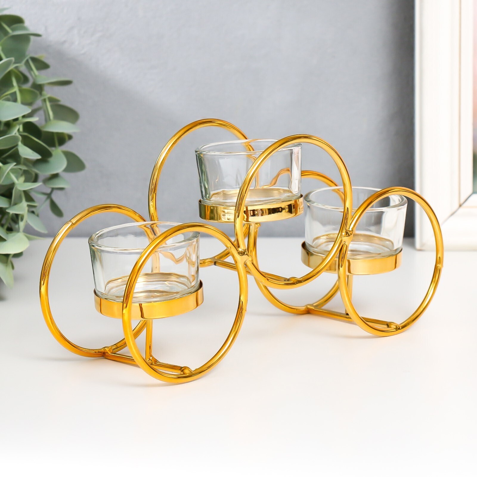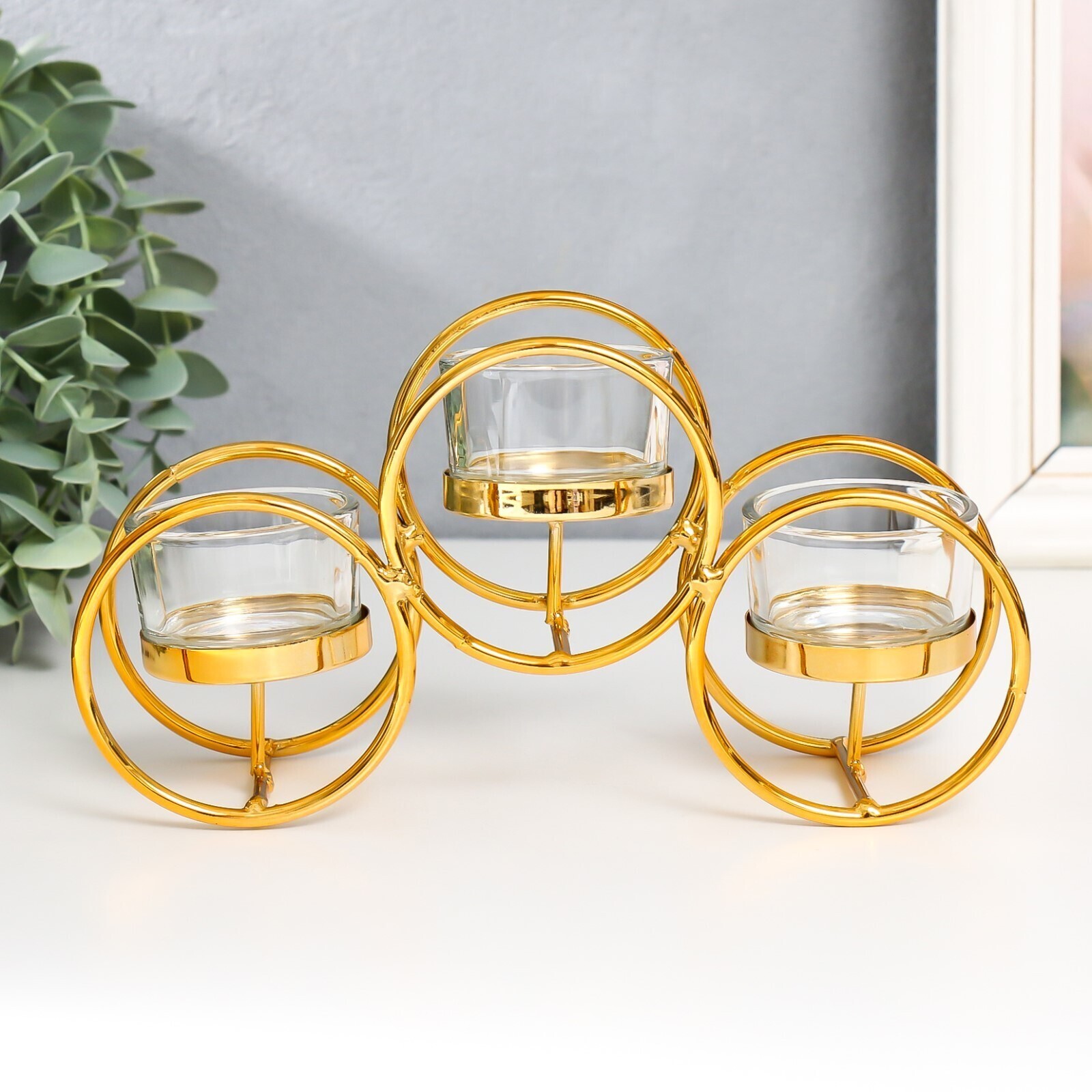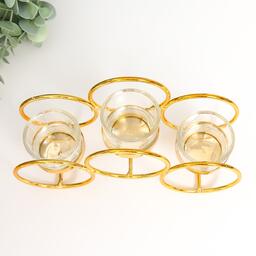 Подсвечник металл, стекло на 3 свечи "Двойные кольца" d-4,5 см золото 22,5х7,5х11 см