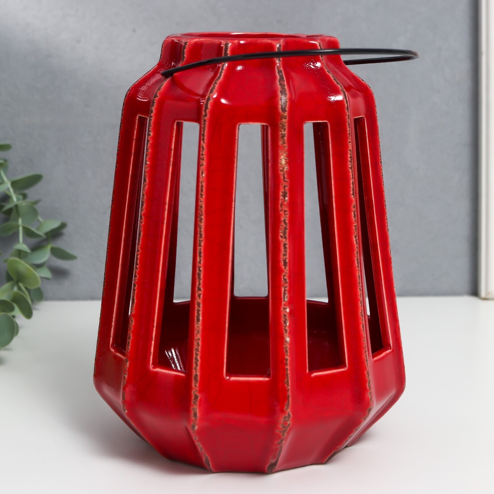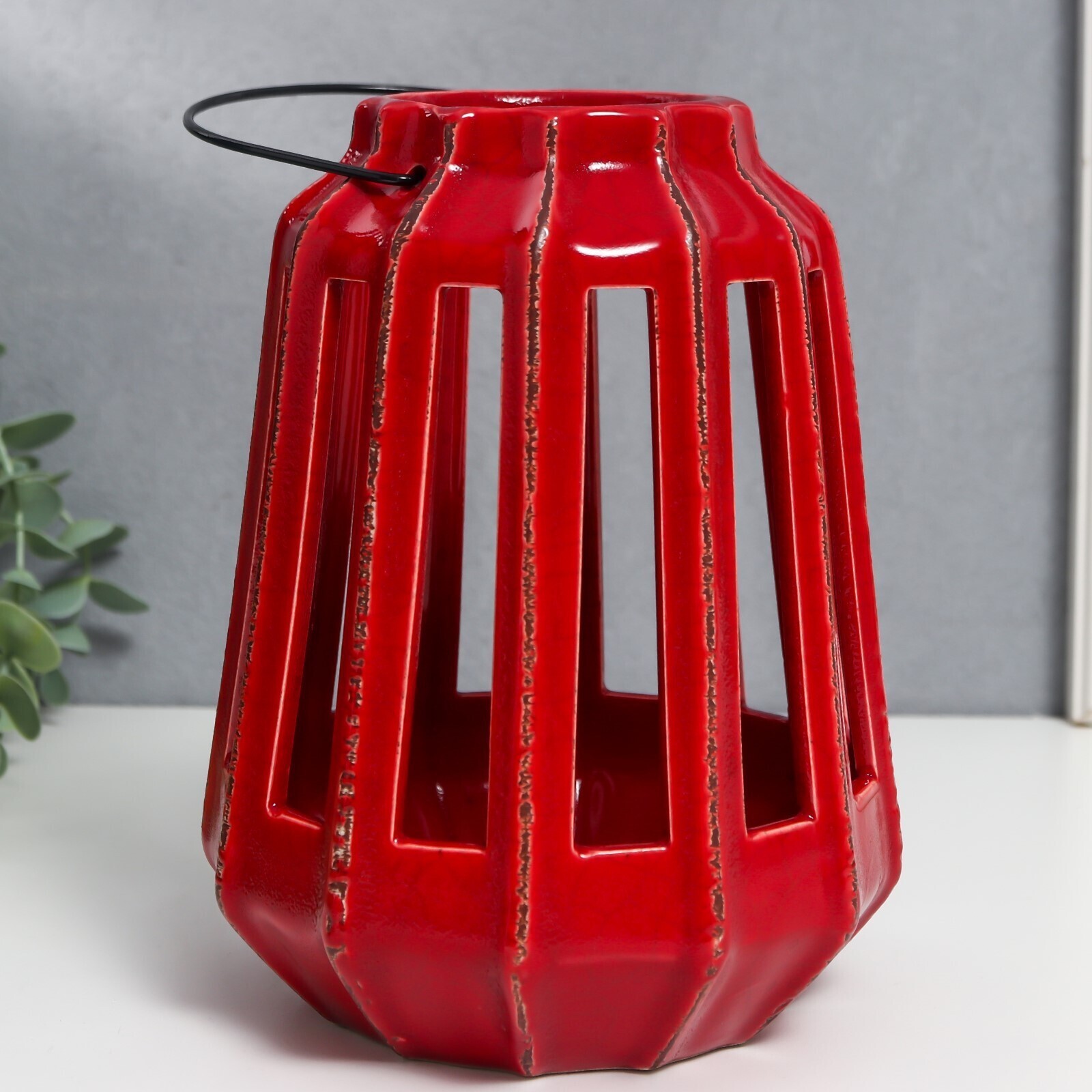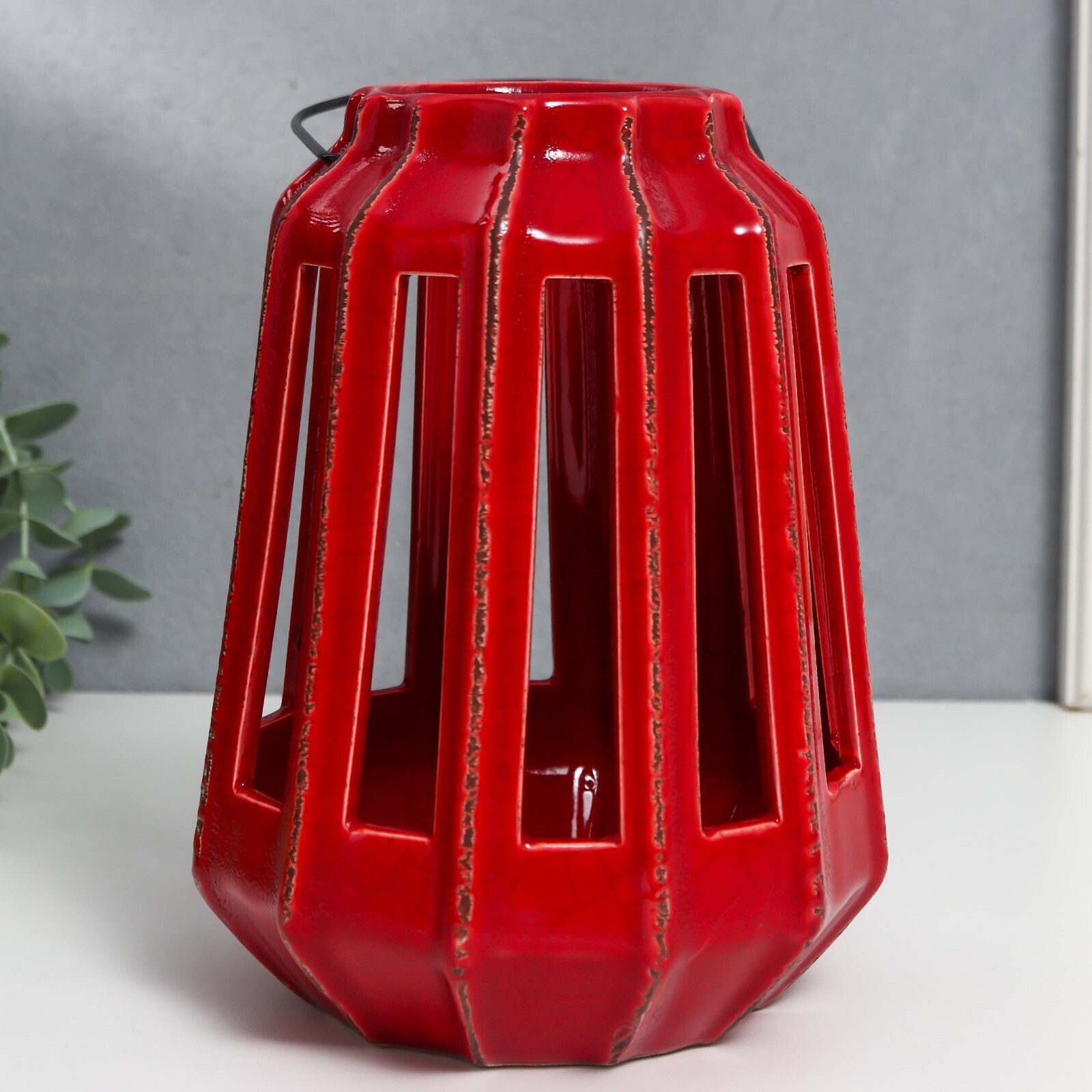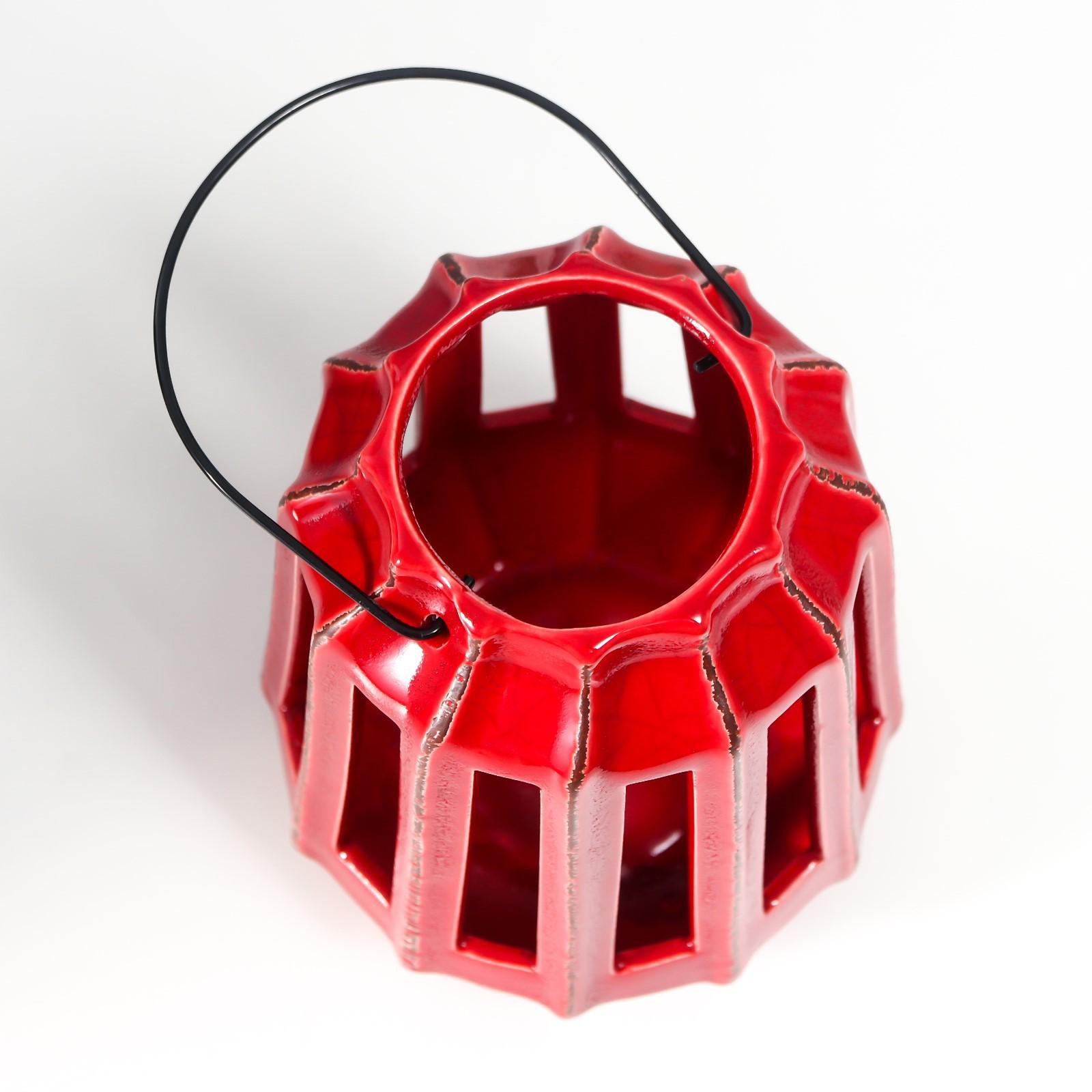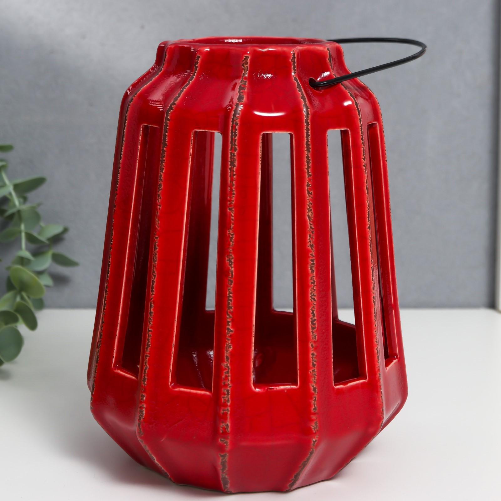 Подсвечник керамика на 1 свечу "Фонарь с вырезами" тёмно-красный 19х14х14 см