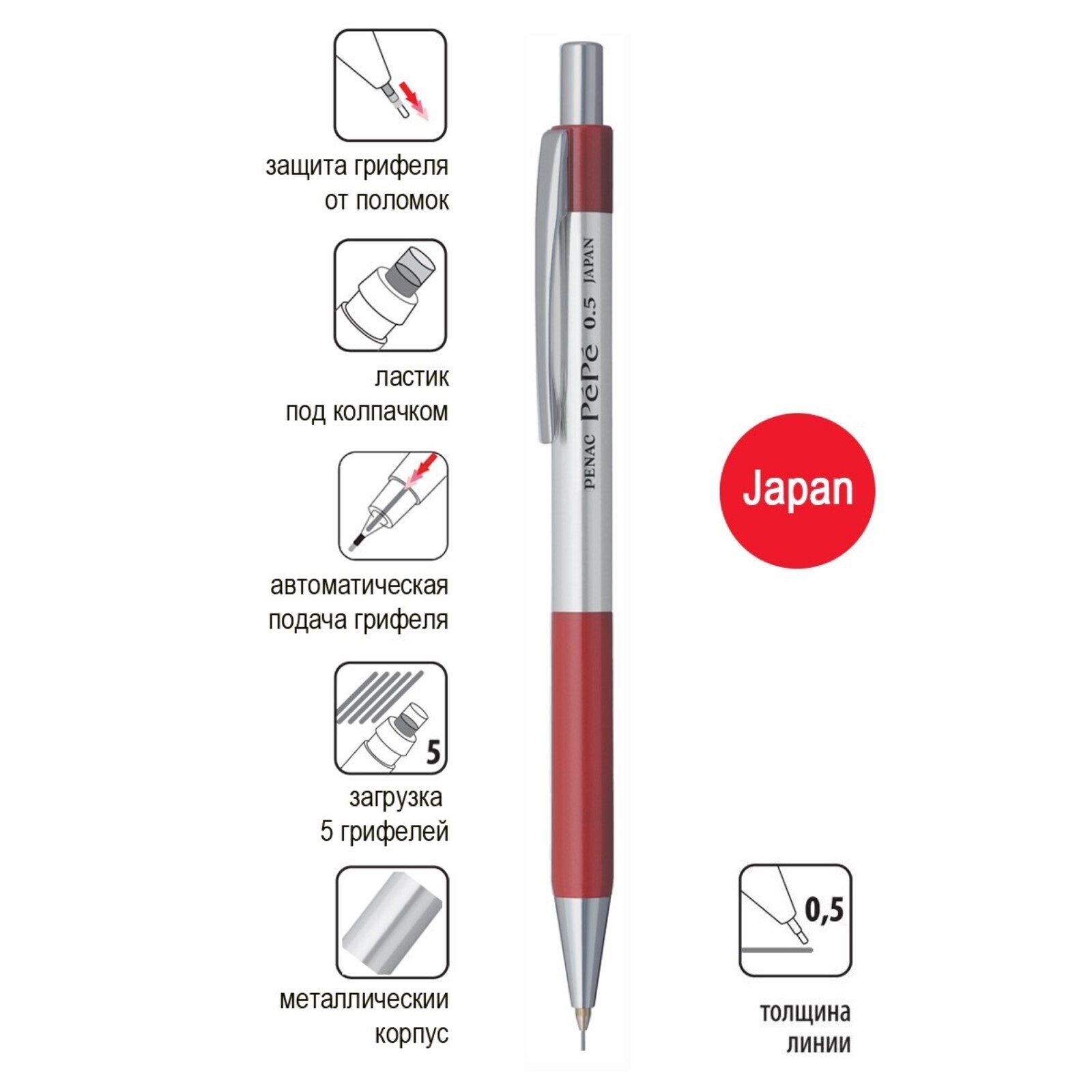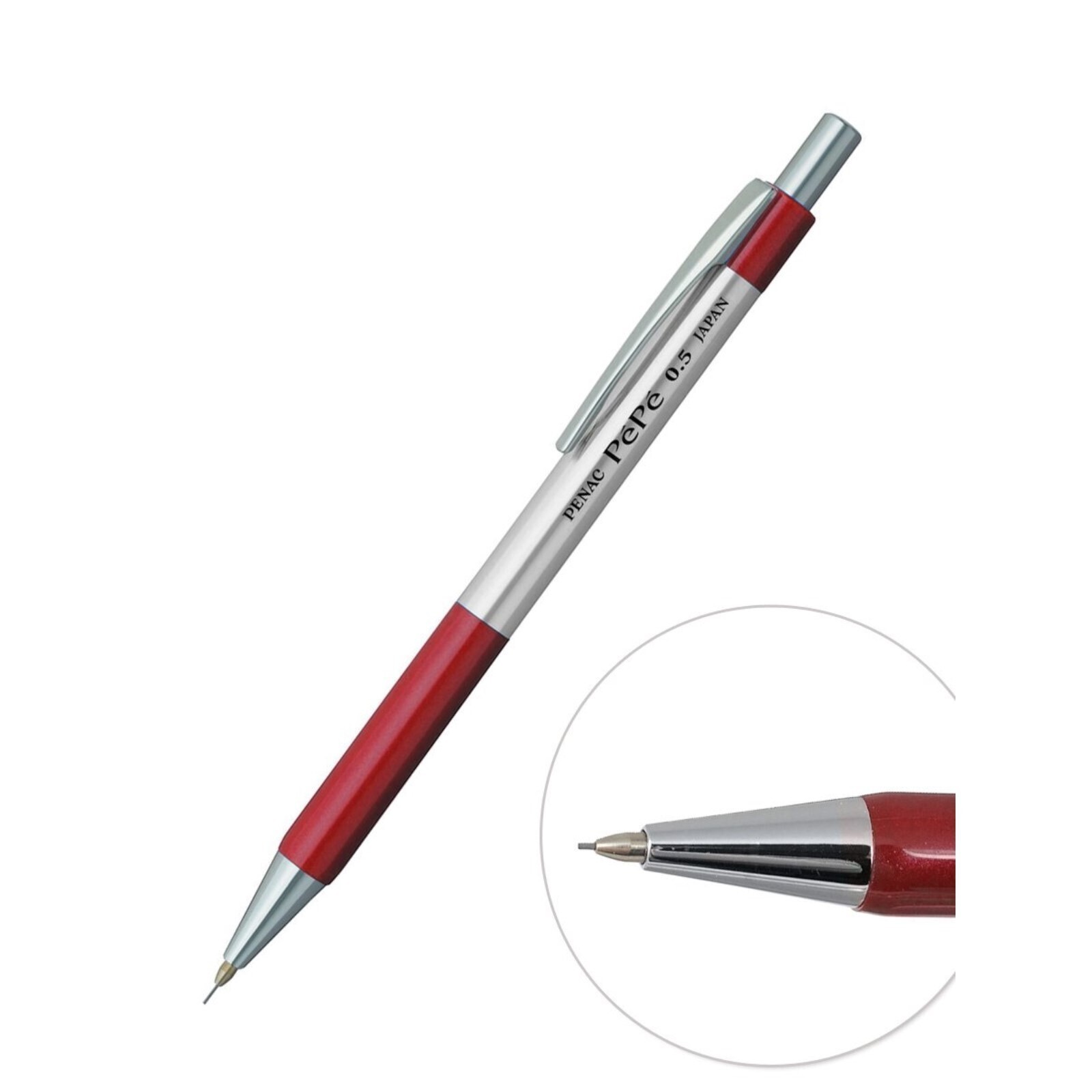 Карандаш механический PEPE 0.5 мм HB японского бренда Penac (Пенак).Сверхпрочный корпус металлического карандаша из нержавеющей стали отличается особой надежностью и долговечностью. Наличие в автоматическом карандаше 0,5мм специального амортизирующего механизма, который пружинит внутри пишущего узла, позволяет грифелю подстраиваться под силу нажима при письме и защищает его от поломок. Система "скользящего" грифеля обеспечивает его непрерывное поступление к пишущему узлу без нажатия на кнопку подачи грифеля - можно писать без остановки. А уникальная запатентованная система Zero Slider в механическом канцелярском карандаше Пенак Пепе позволяет грифелю писать намного дольше чем в обычных механических карандашах со сменными грифелями. При стандартной длине грифеля 60 мм она увеличивает длину письма на 20%. PENAC - японский бренд пишущих инструментов и один из ведущих брендов механических карандашей в мире.