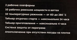 • Программы приготовления Жарка, Суп, Молоко, Рис/Каша, Сохранить горячим, Мощность, Температура