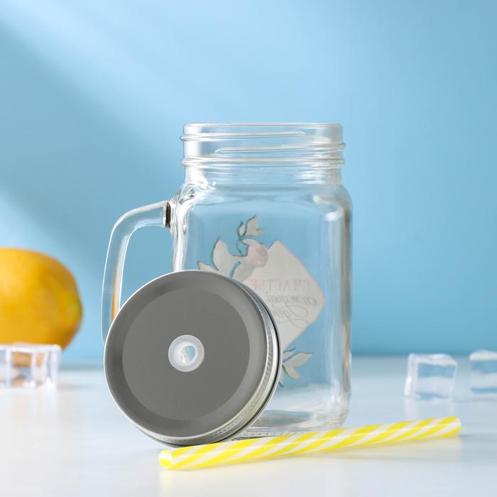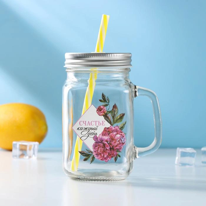 Кружка-банка 450мл "Счастье" с крышкой и трубочкой Доляна 5299825