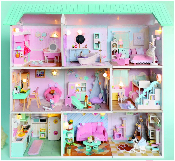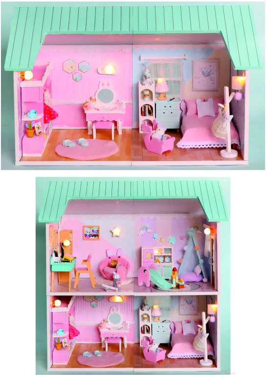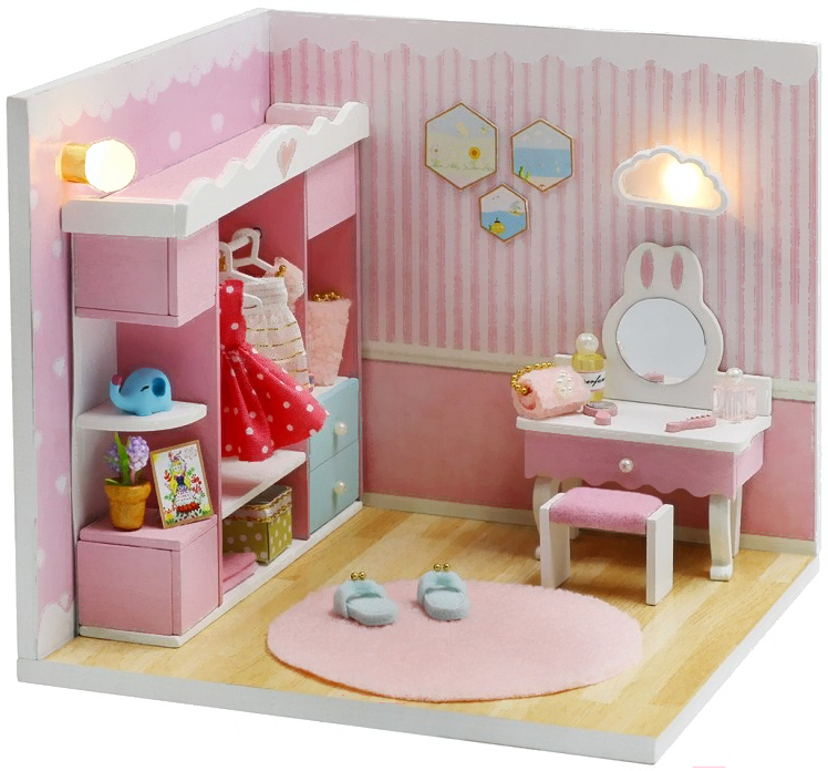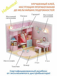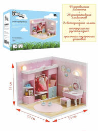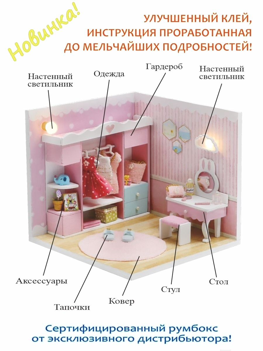 • Комплектация кукольного домика/румбокса стул, шкаф, ковер, декоративный цветок, вешалка для одежды, туалетный столик (с зеркалом), светильник (2 шт.), одежда (3 шт.), полотенце (2 шт.), коробка, флакон (2 шт.), сумочка (2 шт.), лейка, тапки