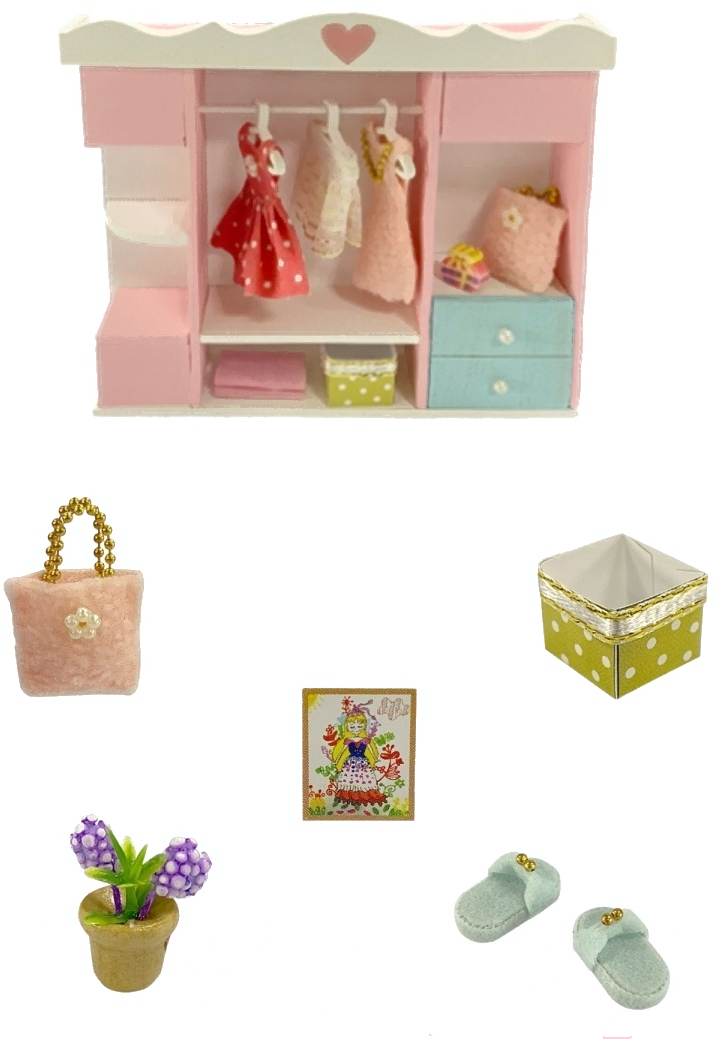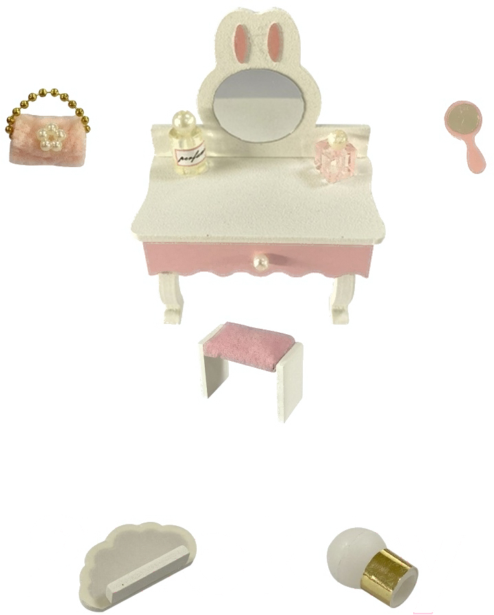 • В комплекте стул, шкаф, ковер, декоративный цветок, вешалка для одежды (3 шт.), вешалка, туалетный столик (с зеркалом), светильник (2 шт.), одежда (3 шт.), полотенце (2 шт.), коробка, флакон (2 шт.), сумочка (2 шт.), лейка, тапки