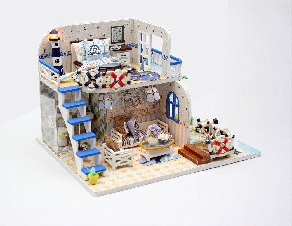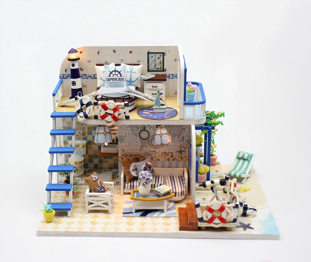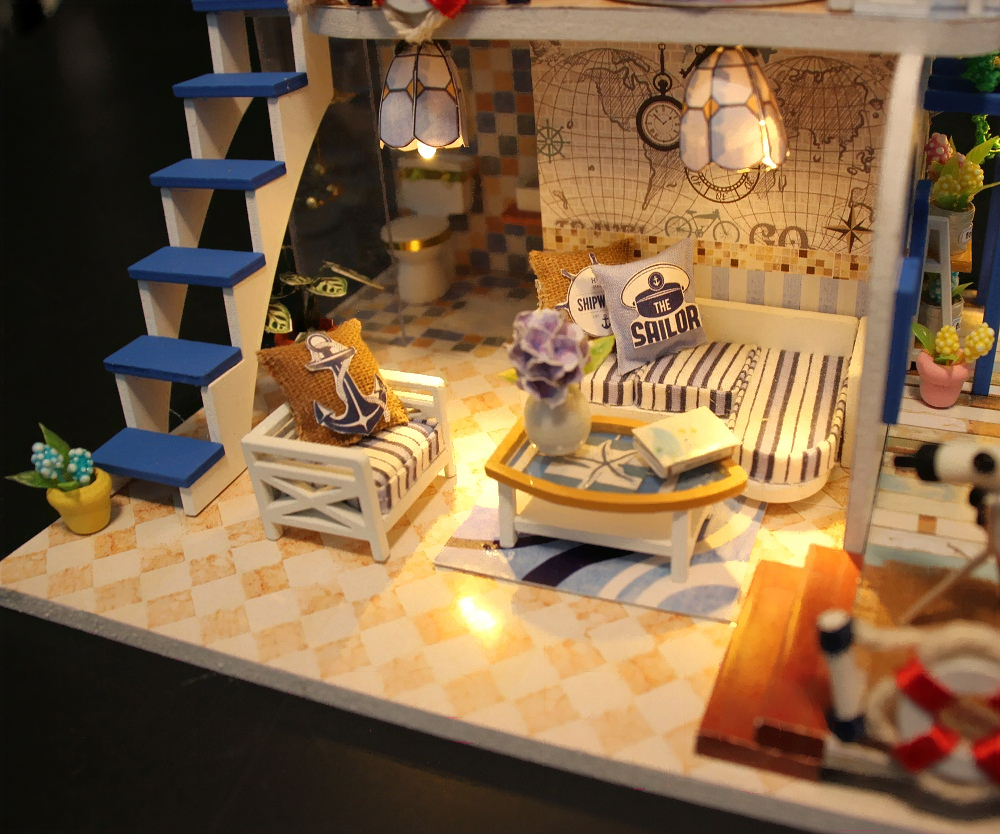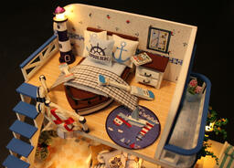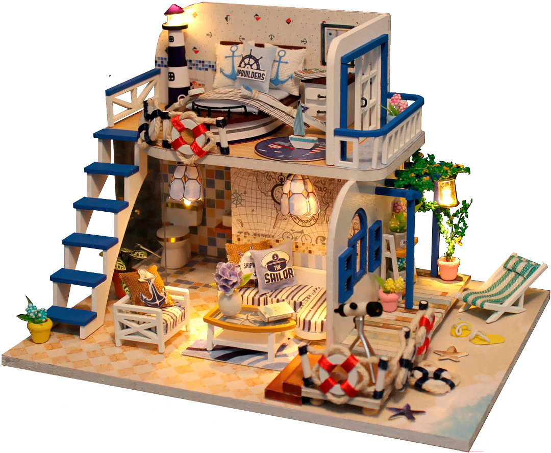 • Комплектация кукольного домика/румбокса кровать, кресло, унитаз, диван, умывальник, люстра (2 шт), ковер (2 шт), журнальный столик, декоративный цветок (7 шт), светильник (2 шт), картина, книга (2 шт), комод, телескоп, лестница, подушка (6 шт), спасательный круг (6 шт), обувь (шлепки), одеяло, весло (2 шт), лежак