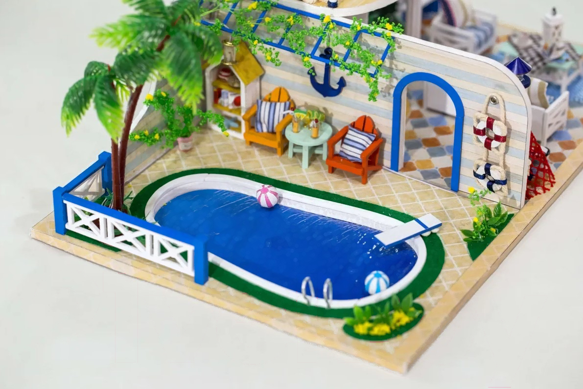 - Комплектация кукольного домика/румбокса кровать, кресло (3 шт), стеллаж, диван, тумба, ковер (2 шт), журнальный столик (2 шт), декоративный цветок (4 шт), пуфик, светильник, рояль, картина (7 шт), книга, дерево, телескоп, лестница, подушка, подсвечник (6 шт), маяк, мяч (2 шт), спасательный круг (2 шт)
