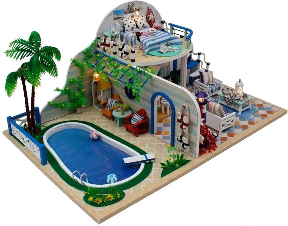 - В комплекте кровать, кресло (3 шт), стеллаж, диван, тумба, ковер (2 шт), журнальный столик (2 шт), декоративный цветок (4 шт), пуфик, светильник, пальма, рояль, картина (7 шт), книга, бассейн, телескоп, лестница, подушка, подсвечник (6 шт), маяк, мяч (2 шт), спасательный круг (2 шт)