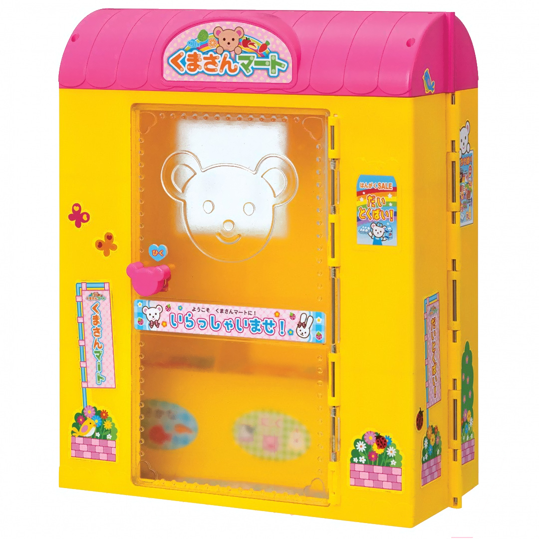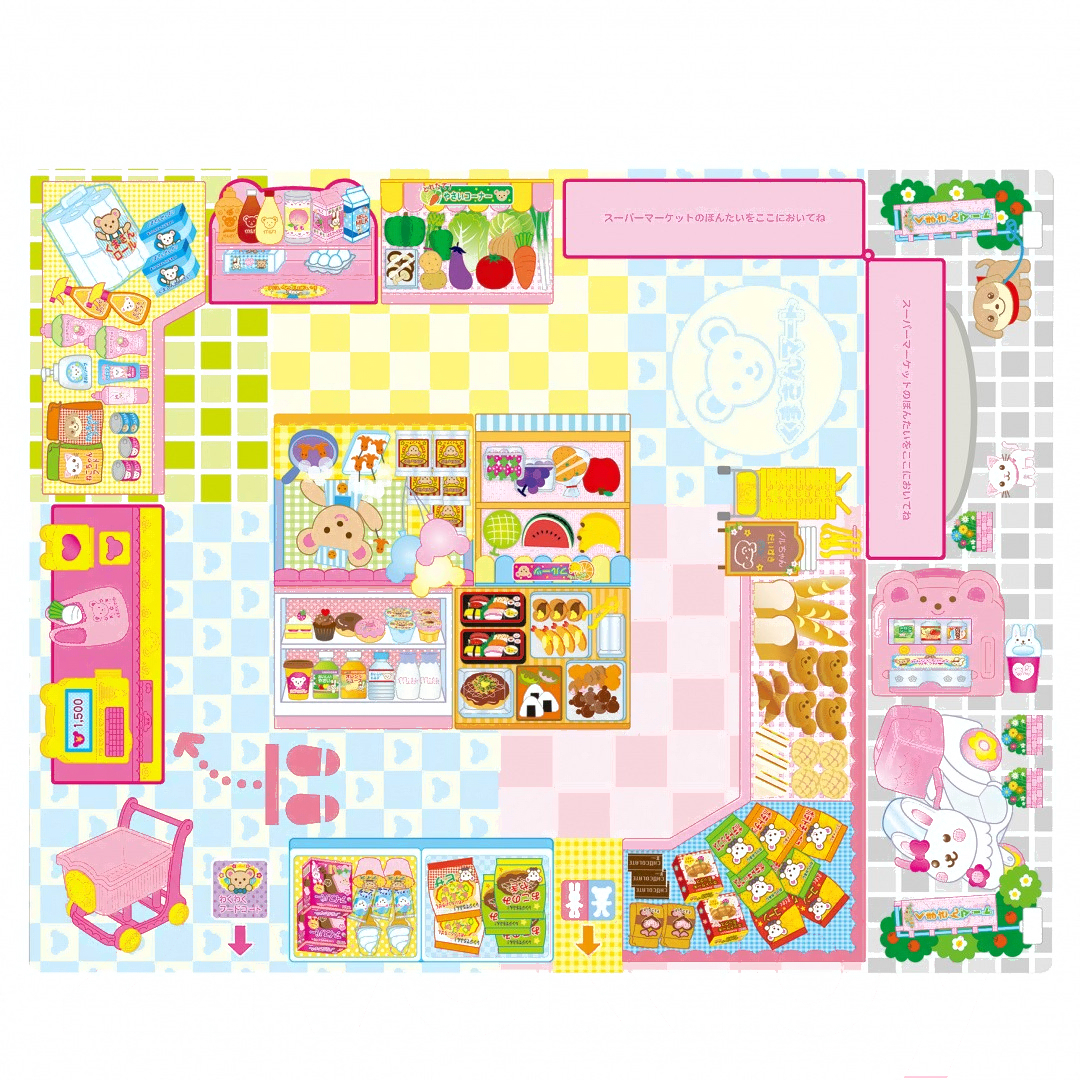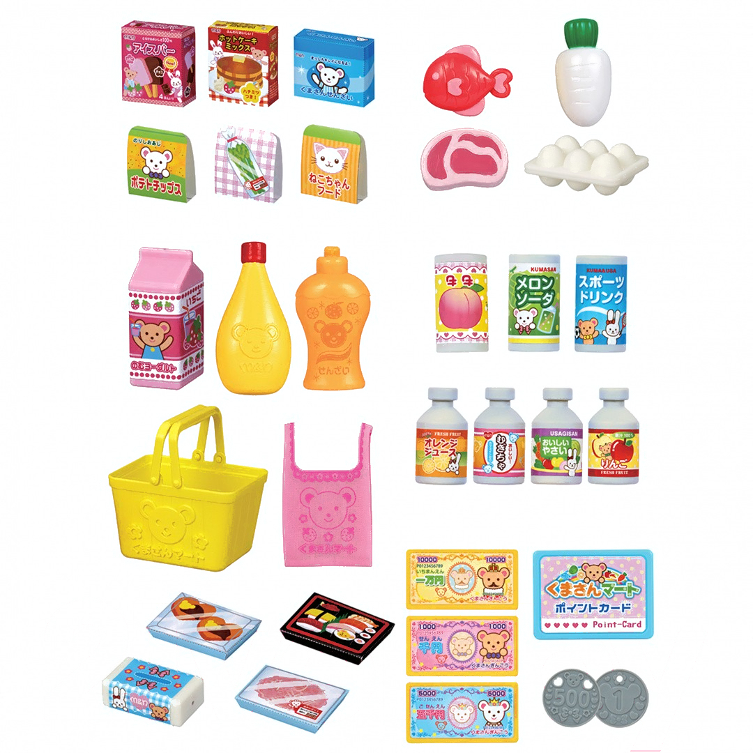 В комплектековер, продукты (9 шт.), стойка (с полками), корзина (для покупок), сумочка, кассовый аппарат, аксессуары для магазина (стикеры, монеты 2шт., карточки 3 шт.)