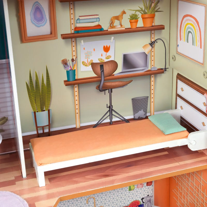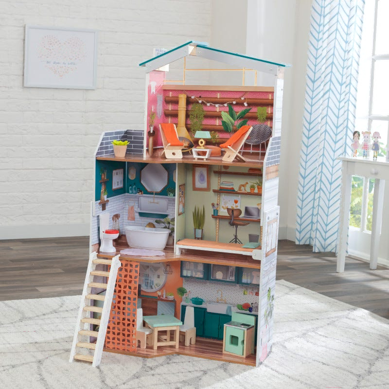 • Комплектация кукольного домика кровать (1 шт), обеденный стол (1 шт), стул (4 шт), ванна (1 шт), унитаз (1 шт), плита (1 шт), ковер (1 шт), журнальный столик (1 шт), декоративный цветок (1 шт), светильник (1 шт), лампа (1 шт), лестница (1 шт), подушка (1 шт)