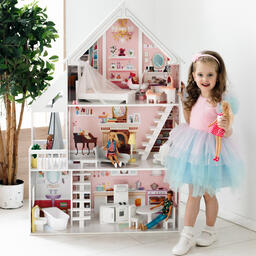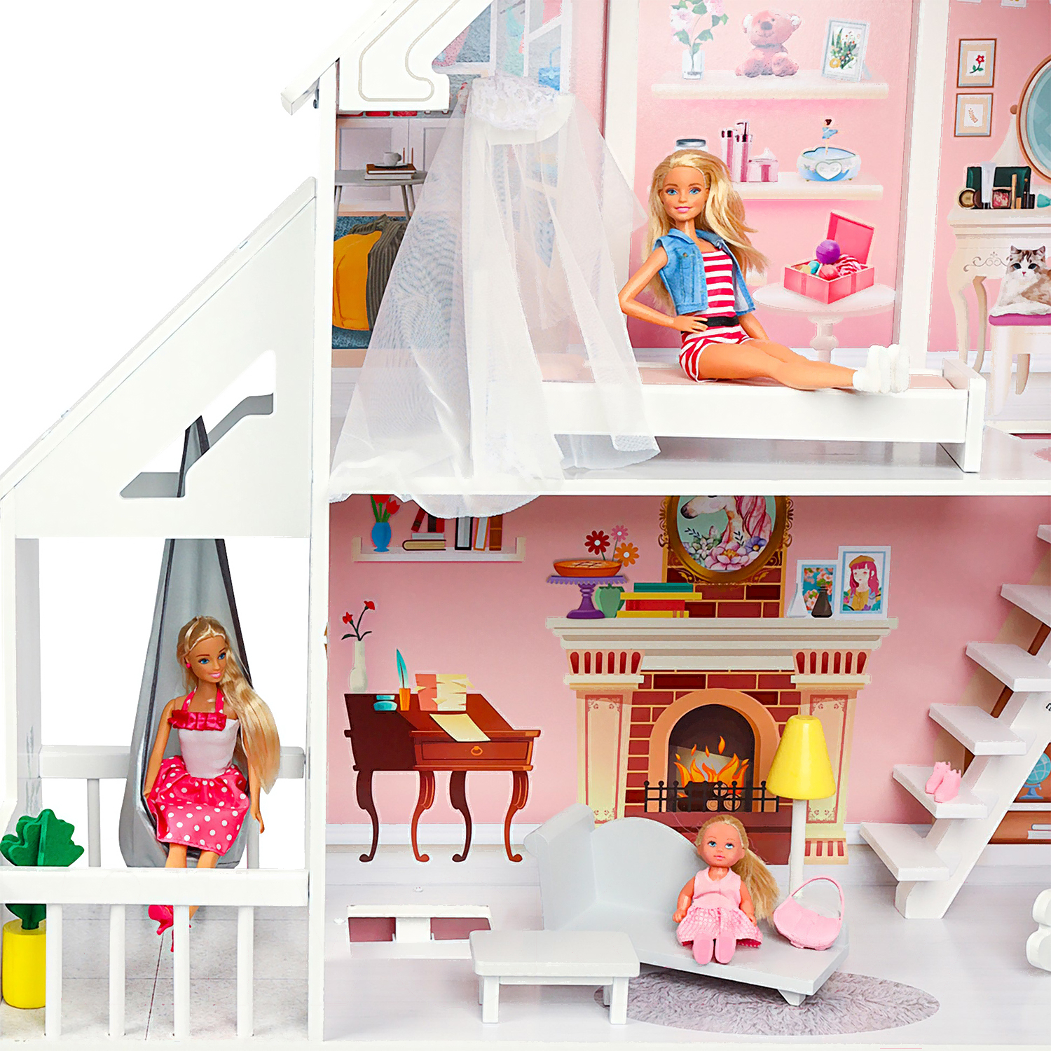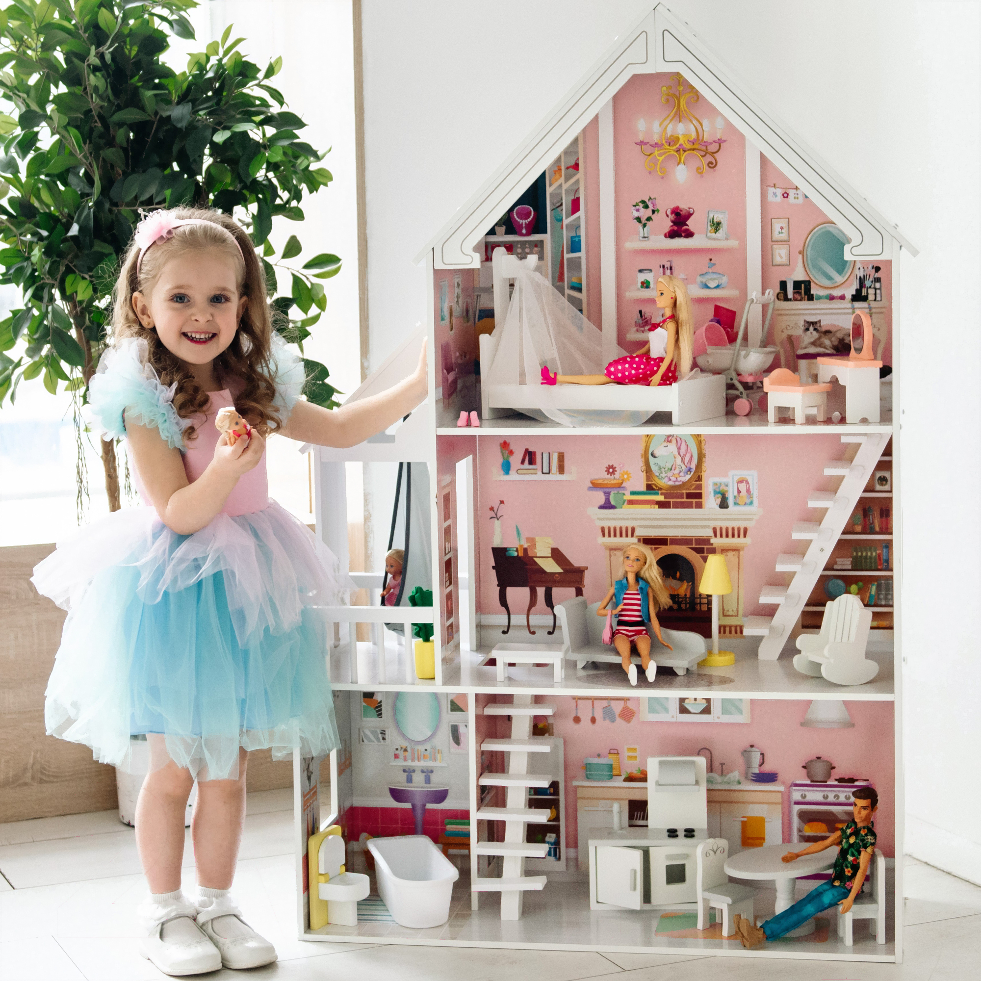 • Комплектация кукольного домика/румбокса кровать, обеденный стол, стул (3 шт.), ванна, торшер, плита, диван, журнальный столик, декоративный цветок, кресло-качалка (подвесное), трюмо, лестница (2 шт.)