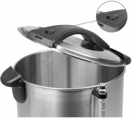 - Прочие особенности и свойства Температуру напитка можно плавно регулировать (30–100 °C). Краник из цельного металла, хромированный (съемный). Термоизолированные ручки. 2 световых индикатора.