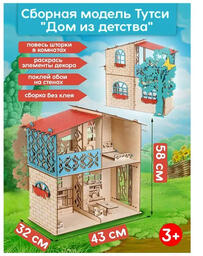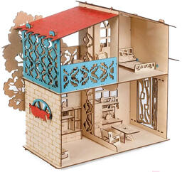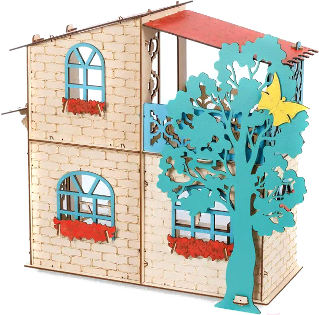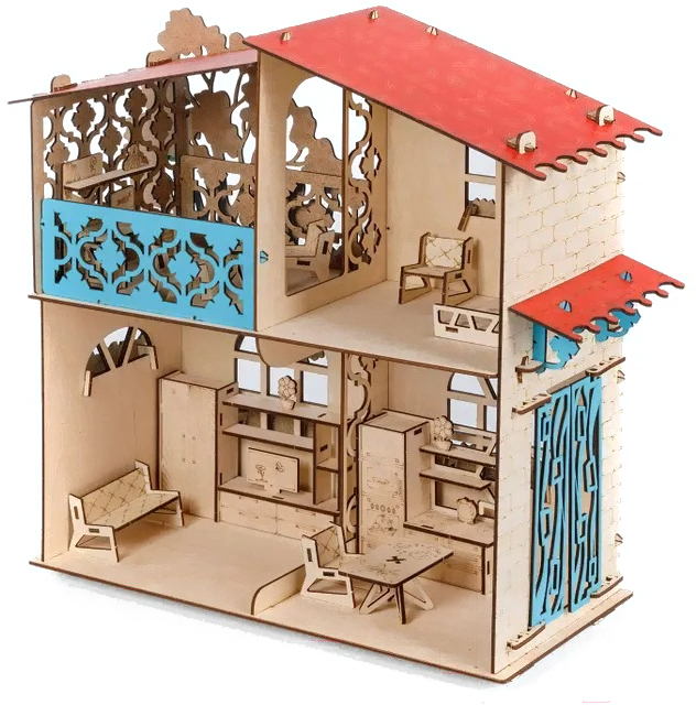 - Комплектация кукольного домика кровать, стул (3 шт), шкаф, телевизор, журнальный столик, кухня, скамья, дерево