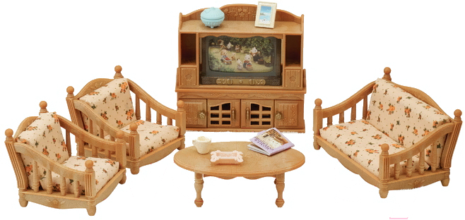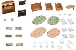 - Вид аксессуара телевизор (+ 6 листов с фотографиями для телевизора), диван (+ 2 сменных материала для него), тумба, посуда (поднос, кружка), фоторамка, кресло (2 шт. + 4 сменных материала для него), шкаф (верхний шкаф для телевизора), книга (журнал), стол, шкатулка