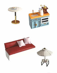 • Комплектация кукольного домика кровать, диван, умывальник, солнечный зонт, декоративный цветок (5 шт.), кухня, полка, раковина, посуда, книга, лестница, стол (2 шт.), подушка (5 шт.), чемодан, еда/напитки, чайник, мотоцикл