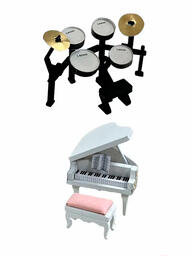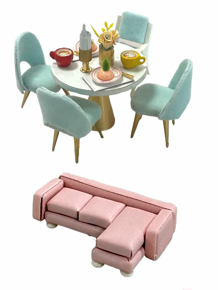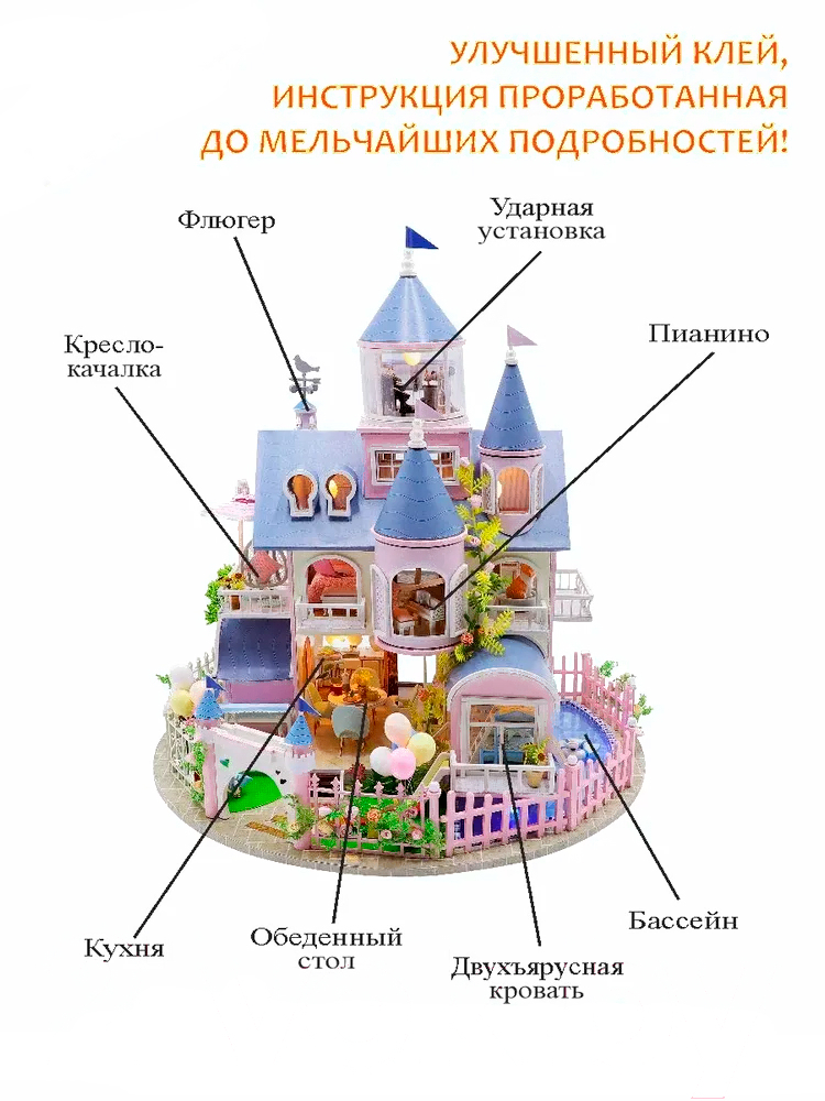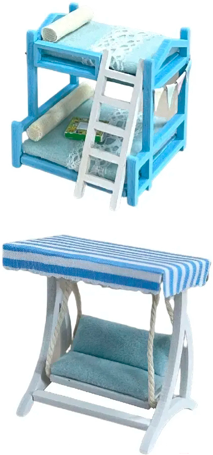 • Комплектация кукольного домика/румбокса кровать (2 шт.), обеденный стол, стул (4 шт.), ванна, унитаз, диван, тумба, умывальник, зеркало (пляжный), пианино, ковер, качели (2 шт), декоративный цветок, пуфик, лежанка для животных, кухня, зонт, картина, посуда, кресло-качалка (2 шт.), забор, животное (кот, собака), еда/напитки, аксессуар для животных (когтеточка), столовые приборы, барабанная установка, флюгер