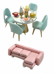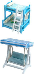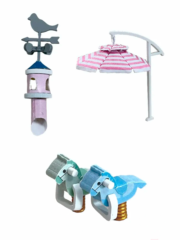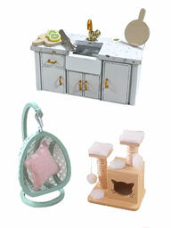 • Комплектация кукольного домика кровать (2 шт.), обеденный стол, стул (4 шт.), ванна, унитаз, диван, тумба, умывальник, зеркало (пляжный), пианино, ковер, качели (2 шт), декоративный цветок, пуфик, лежанка для животных, кухня, зонт, картина, посуда, кресло-качалка (2 шт.), забор, животное (кот, собака), еда/напитки, аксессуар для животных (когтеточка), столовые приборы, барабанная установка, флюгер