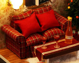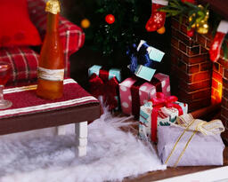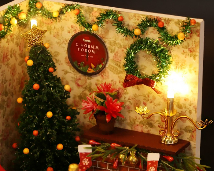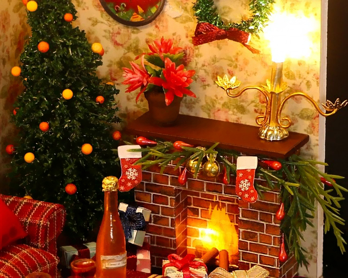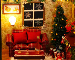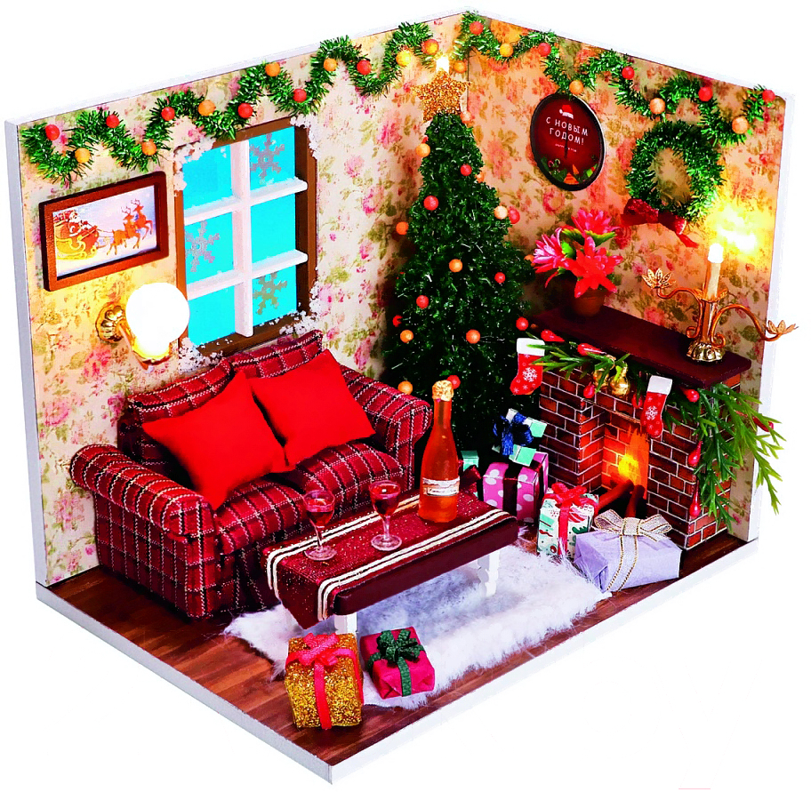 • Комплектация кукольного домика/румбокса диван, ковер, журнальный столик, камин, часы, декоративный цветок (цветок в горшке, ветки, венок), светильник (2 шт.), картина, посуда (бокалы), дерево (новогодняя елка), подушка, подарок (7 шт.), еда/напитки (бутылка), скатерть, окно, украшение (гирлянда, снежинки)