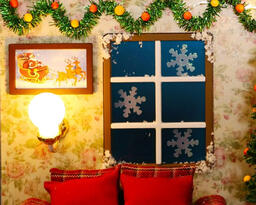 • В комплекте диван, ковер, журнальный столик, камин, часы, декоративный цветок (цветок в горшке, ветки, венок), светильник (2 шт.), картина, посуда (бокалы), дерево (новогодняя елка), подушка, подарок (7 шт.), еда/напитки (бутылка), скатерть, окно, украшение (гирлянда, снежинки)