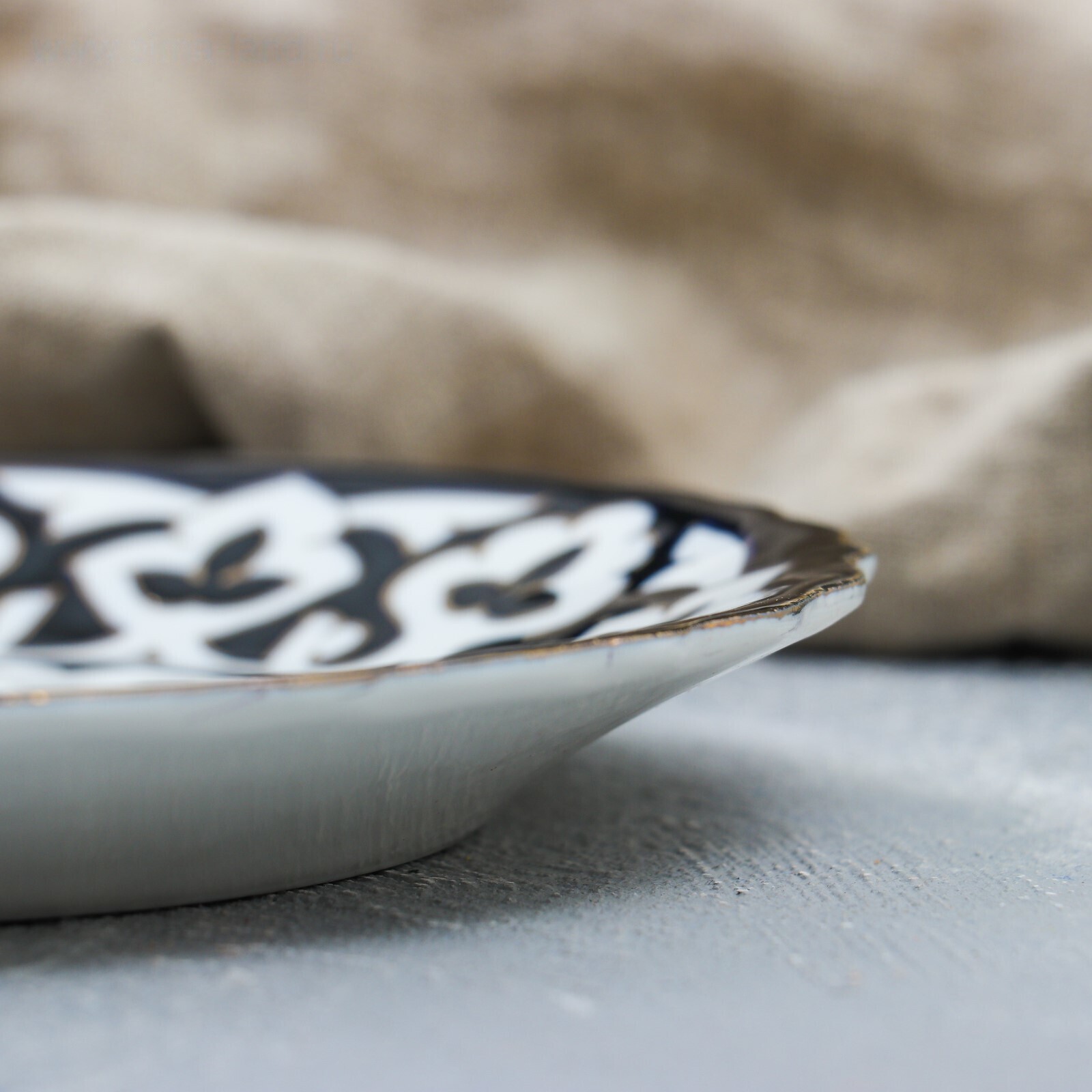 Национальная узбекская роспись «Пахта» сдержанна и благородна. Витиеватые узоры выводятся тонкой кистью, фон заливается тёмно-синим кобальтом. Контур изображений очерчен золотой каймой, придающей изделию блеск и роскошь. Густая глазурь наносится толстым слоем, благодаря чему рисунок мерцает.