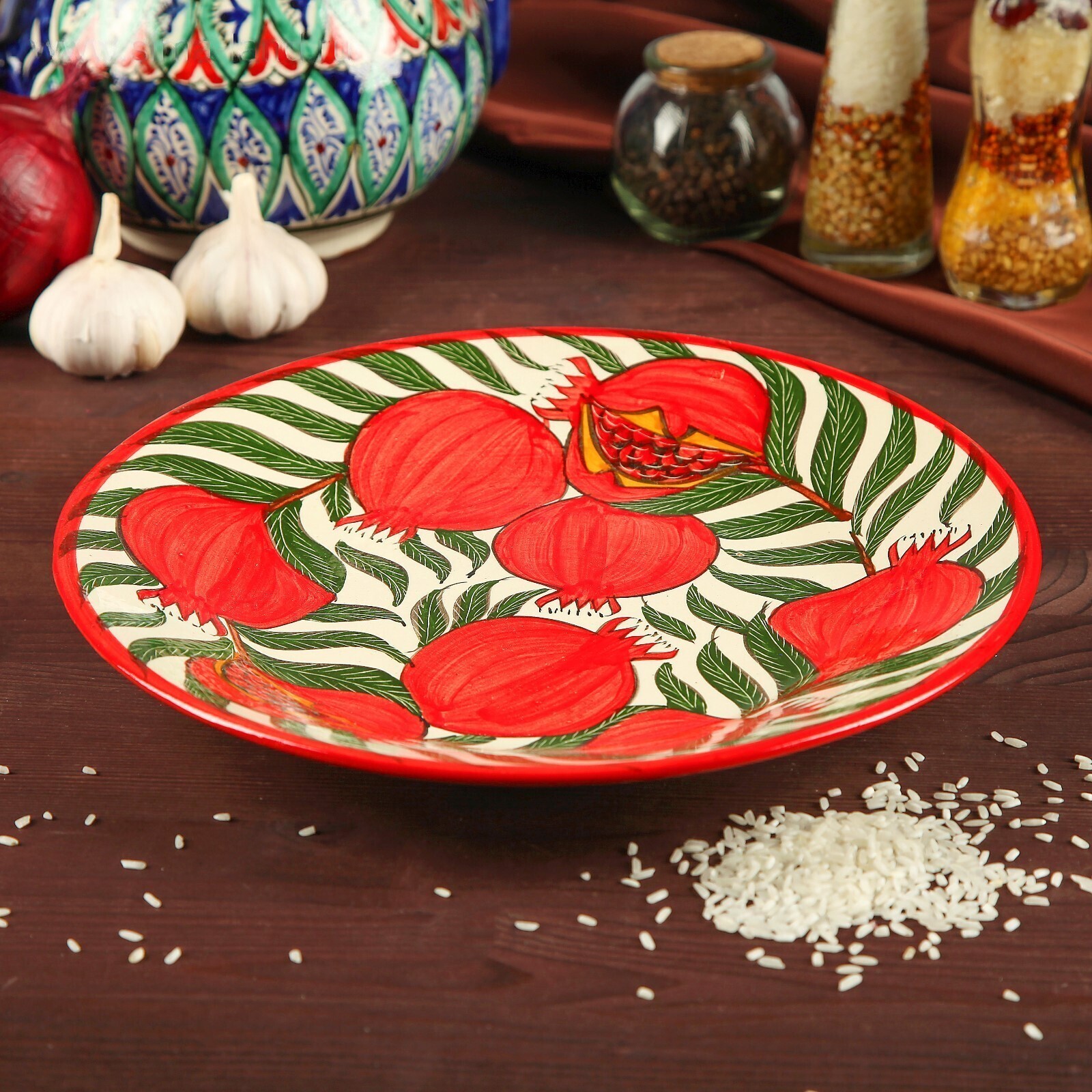 Риштан — город на востоке Узбекистана, один из древнейших в Ферганской долине. С давних времён Риштан славится своим гончарным искусством изготовления цветной керамики. Красноватую глину для изделия добывают в самом городе. Мастера утверждают, что их глина настолько высокого качества, что даже не нуждается в предварительной обработке. Дополните коллекцию кухонных аксессуаров пряными восточными нотами.