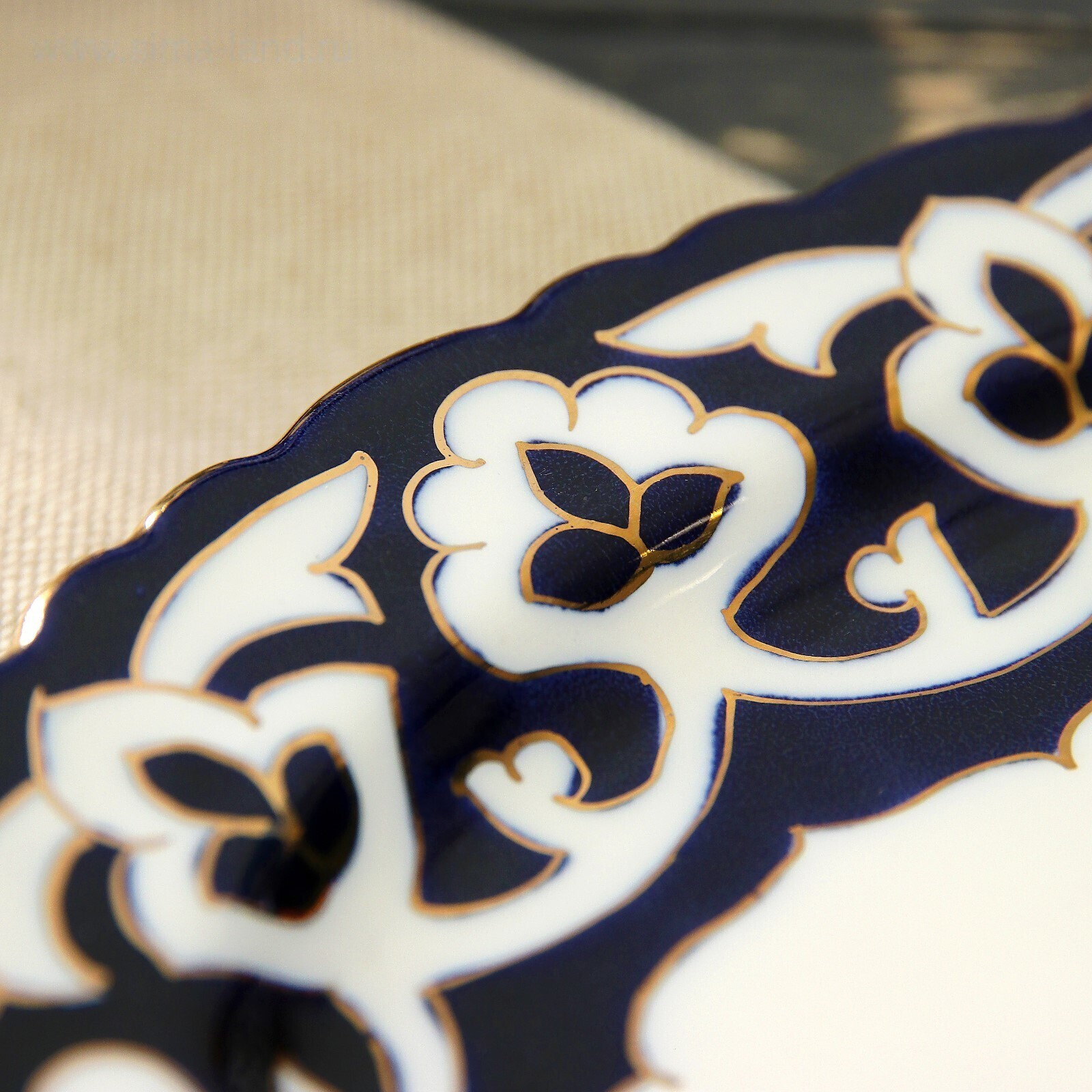 Национальная узбекская роспись «Пахта» сдержанна и благородна. Витиеватые узоры выводятся тонкой кистью, фон заливается тёмно-синим кобальтом. Контур изображений очерчен золотой каймой, придающей изделию блеск и роскошь. Густая глазурь наносится толстым слоем, благодаря чему рисунок мерцает.