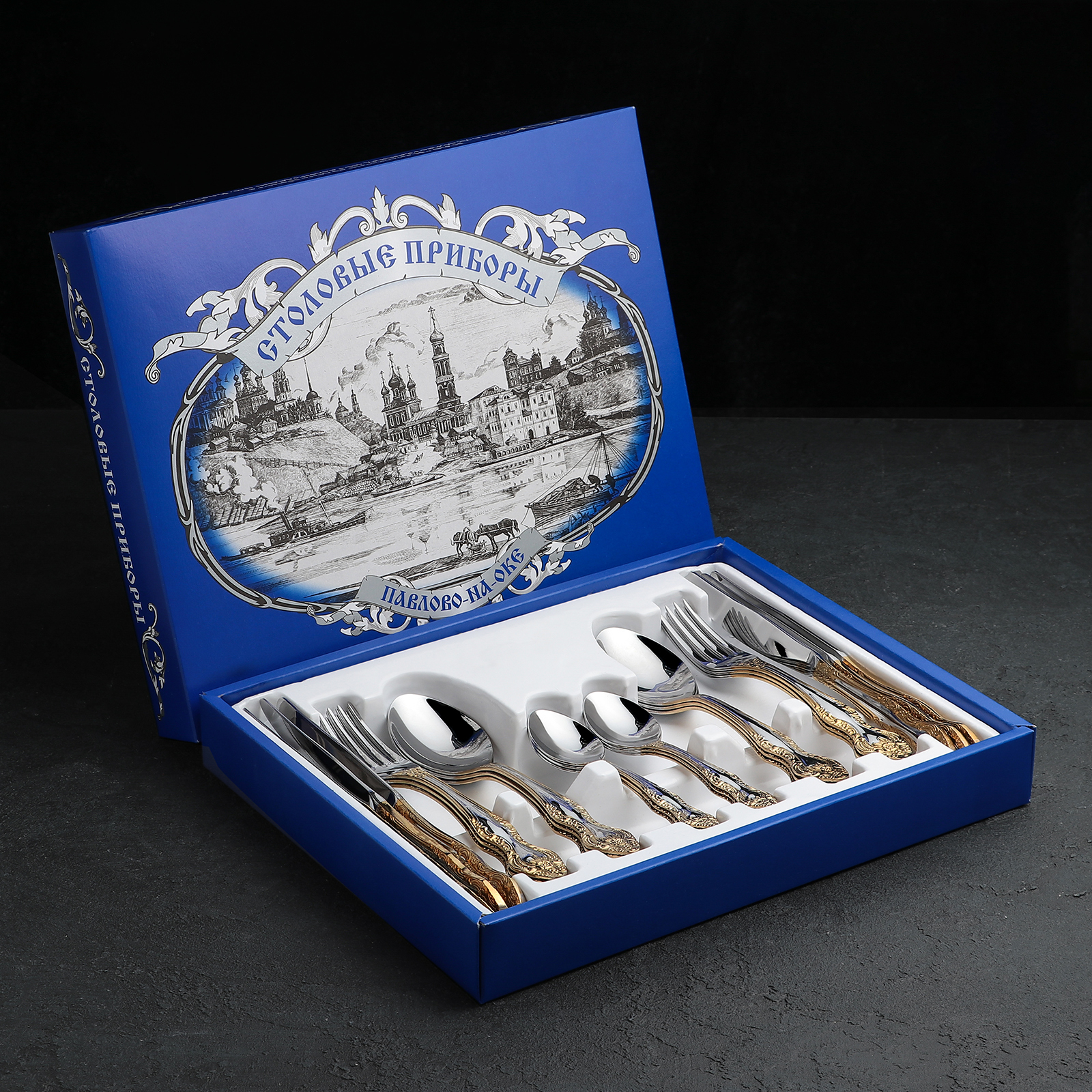 Набор столовых приборов «Тройка», 24 предмета, толщина 2 мм, локальное нитрид-титановое покрытие, декоративная коробка