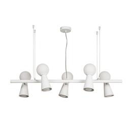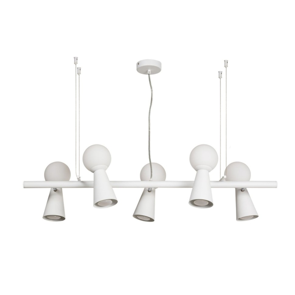 каркас белого цвета, поворотные плафоны с двумя источниками света - стеклянный выдувной матовый шар с лампой G9 и металлический конус с лампой GU10, лампы можно менять