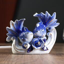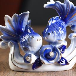 Великолепная морская композиция представлена искусными мастерами керамического ремесла, которые идеально совместили молочно-белое сияние материала и золотистый блеск декоративных элементов. Сувенир керамика "Две рыбки с розой" страза 11х14х7,5 см — изысканный предмет интерьера, прекрасный подарок с особым смыслом. Ведь рыба — это символ мудрости, спасения и учения. По некоторым легендам даже считается, что человечество произошло от существа, напоминающего амфибию, и, что рыбы участвовали в процессе сотворения мира, принося с глубин ил, из которого создаётся суша. А, например, в фэншуй символ рыбы приносит успех, счастье и изобилие. Чаще всего таких рыбок приобретают в качестве талисмана или оберега, дарят на Новый год, желая финансового процветания.