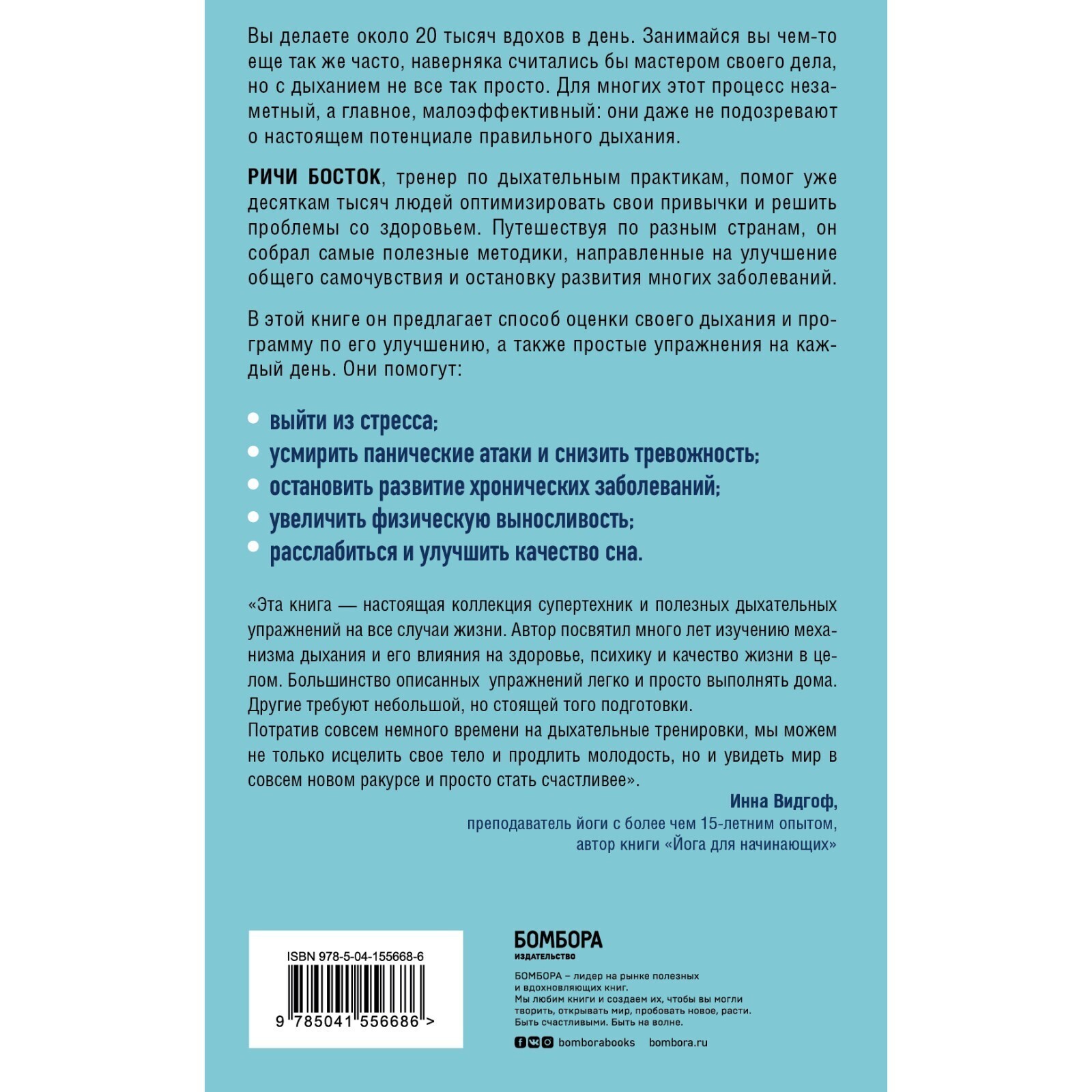 Ваша жизнь начинается с первого вздоха и заканчивается последним, каждый год вы вдыхаете около 8 миллионов раз, но даже не подозреваете, что на самом деле не умеете правильно дышать. А ведь дыхание — настоящая суперсила и может подзарядить лучше, чем чашка эспрессо, помочь ясно и креативно мыслить, успокоить встревоженный разум и расслабиться в считанные минуты. У этого процесса есть свои правила, методики и лайфхаки, которыми в своей книге и делится тренер Ричи Босток.