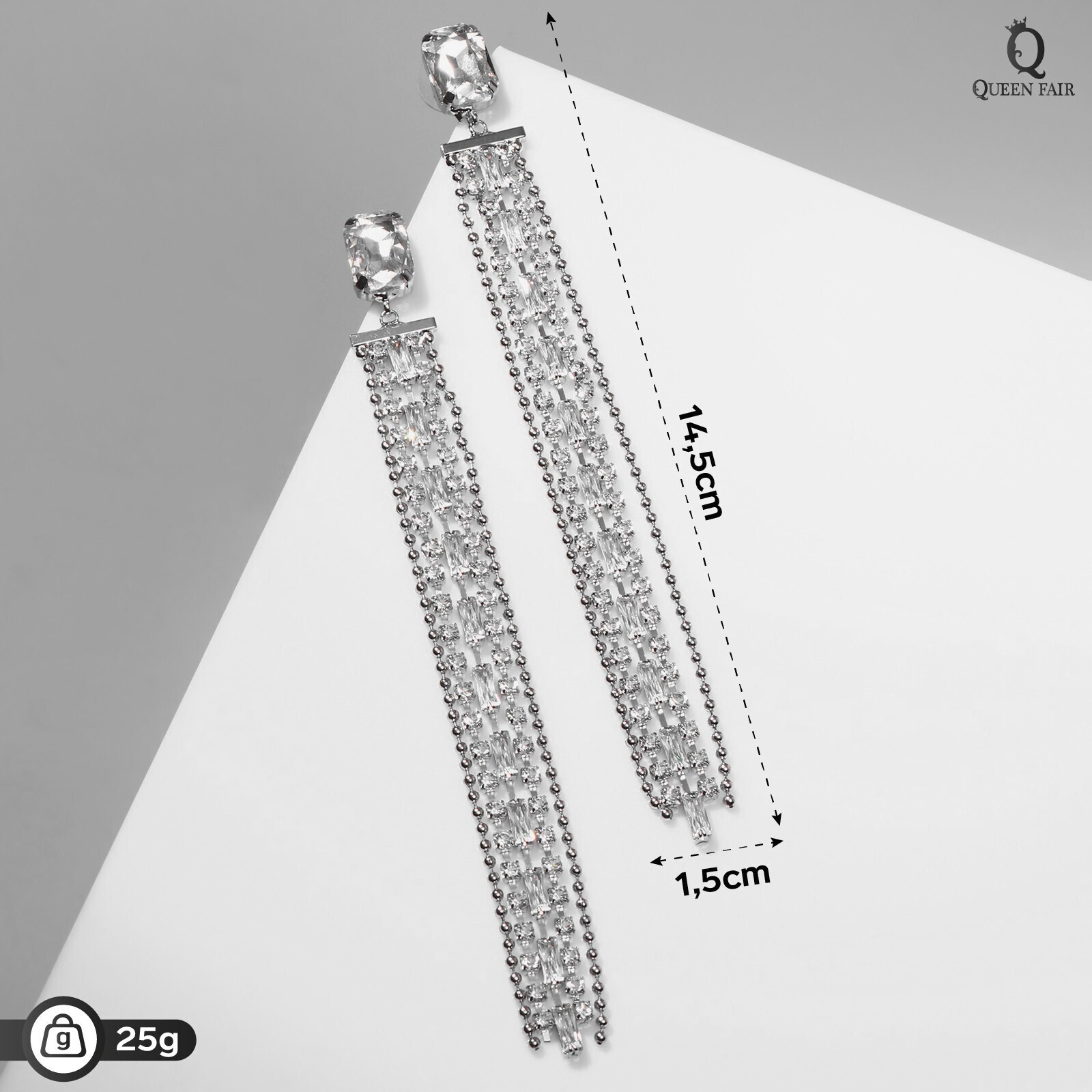 Серьги висячие со стразами "Водопад" дама, цвет белый в серебре