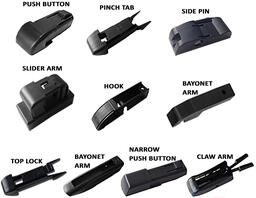 • Вид крепления Bayonet (штыковой замок) (2 шт.), Hook (крючок), Pinch Tab (боковой зажим) (19 мм), Push Button (стандартная кнопка, 19 мм), Side Pin (боковой штырь), Top Lock (верхний замок), Claw (клешня), Narrow Push Button (узкая кнопка, 16 мм), Slider (ползунок)