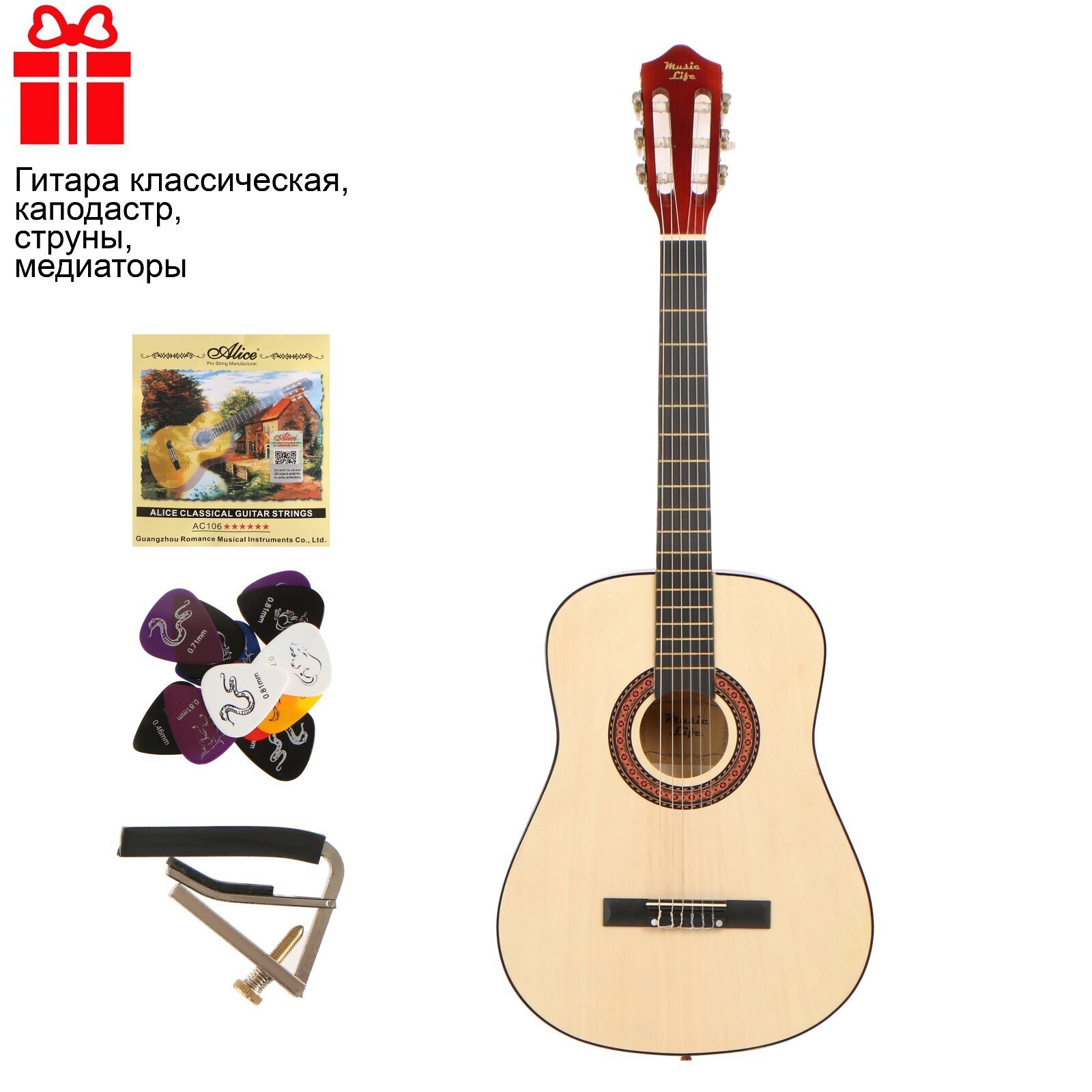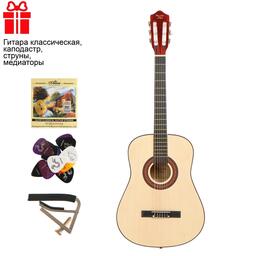 Набор гитариста премиум, бежевый: Гитара классическая, Каподастр, Струны
