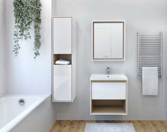 LOUNA – это коллекция, отвечающая последним тенденциям рынка: сочетание чистоты белого цвета и натурального дерева. Основной отличительной особенностью коллекции является её дизайн – сочетание белого с деревом, фрезерованная ручка, выдвижной ящик и удобная открытая полка для хранения. Пенал оборудован стеклянными полками и открытой нишей. Зеркала в коробе ЛДСП оборудованы сенсорной подсветкой.