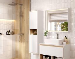 LOUNA – это коллекция, отвечающая последним тенденциям рынка: сочетание чистоты белого цвета и натурального дерева. Основной отличительной особенностью коллекции является её дизайн – сочетание белого с деревом, фрезерованная ручка, выдвижной ящик и удобная открытая полка для хранения. Пенал оборудован стеклянными полками и открытой нишей. Зеркала в коробе ЛДСП оборудованы сенсорной подсветкой.